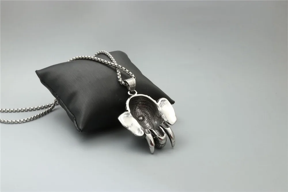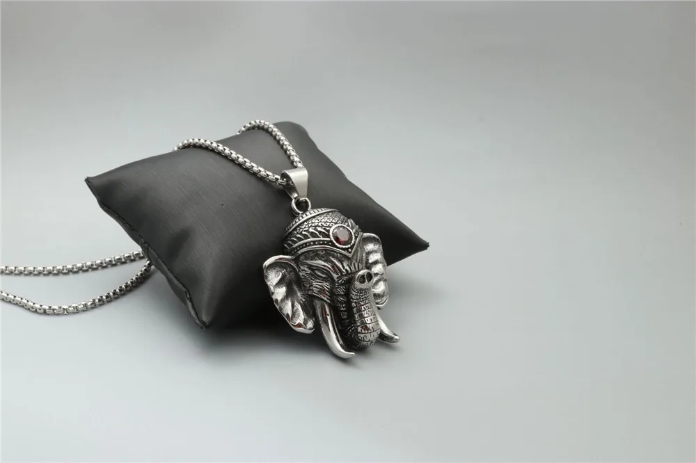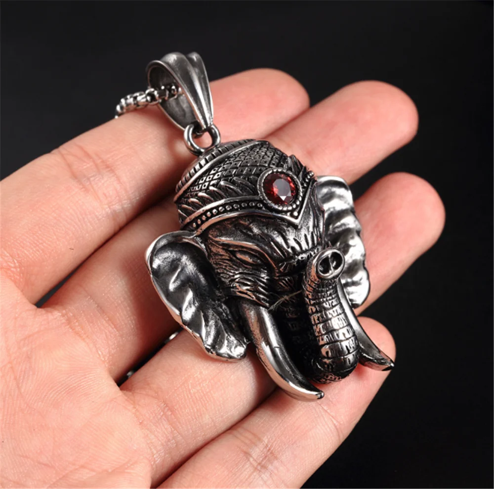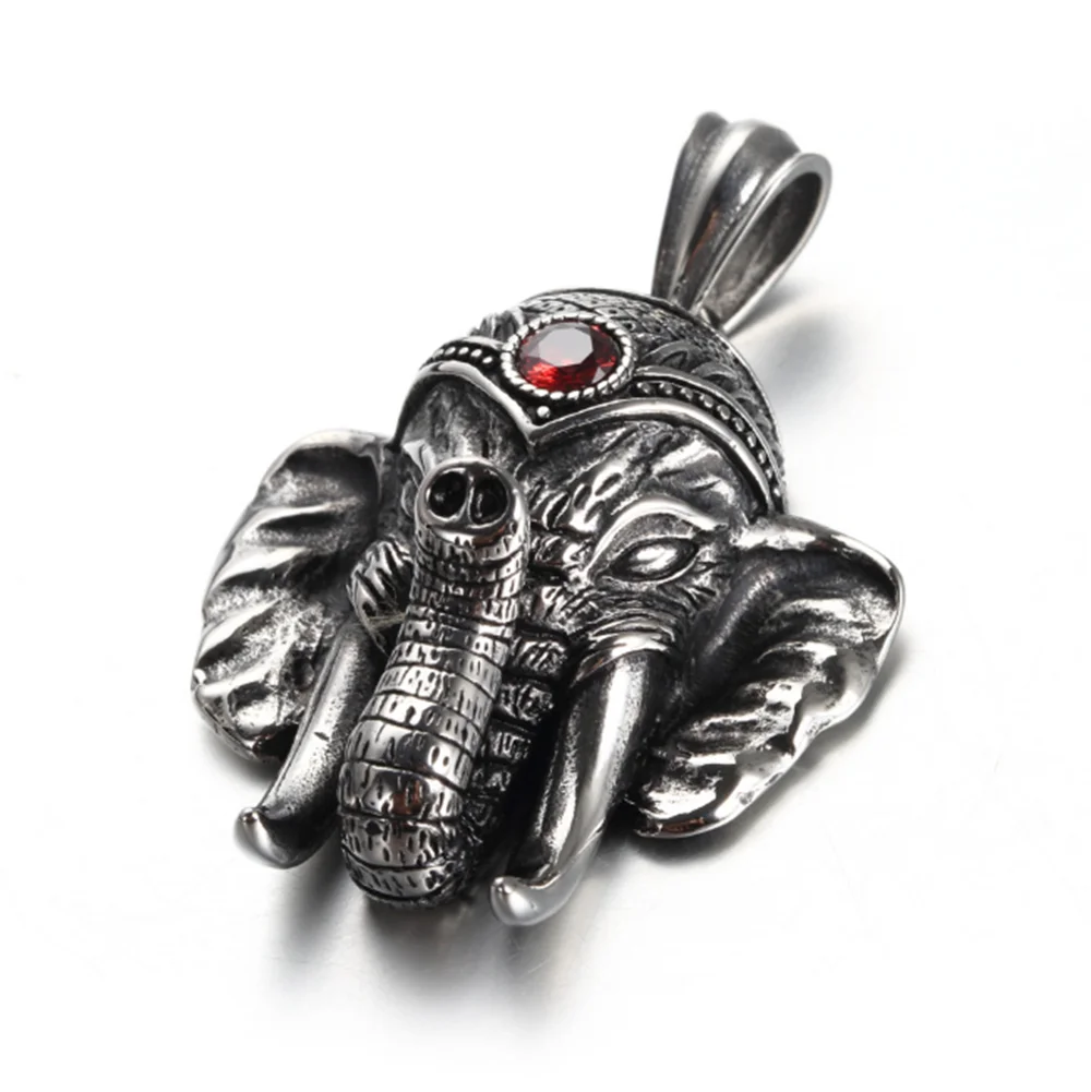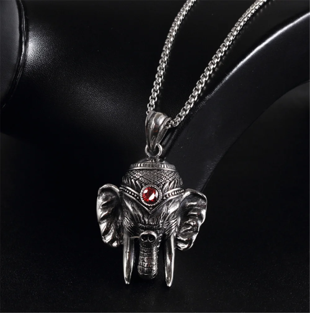 100% Stainless Steel Vintage Distressed Red Zircon Mascot Elephant Elephant God Buddha Titanium Steel Pendant Necklace