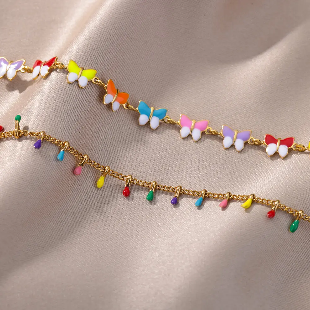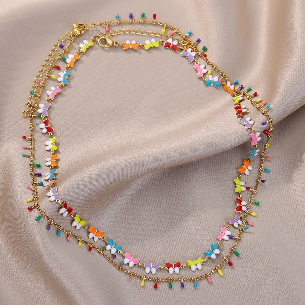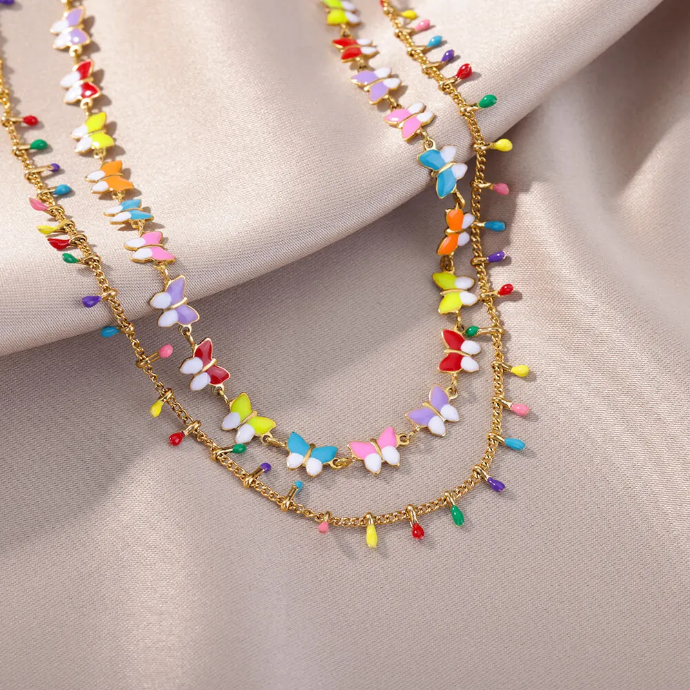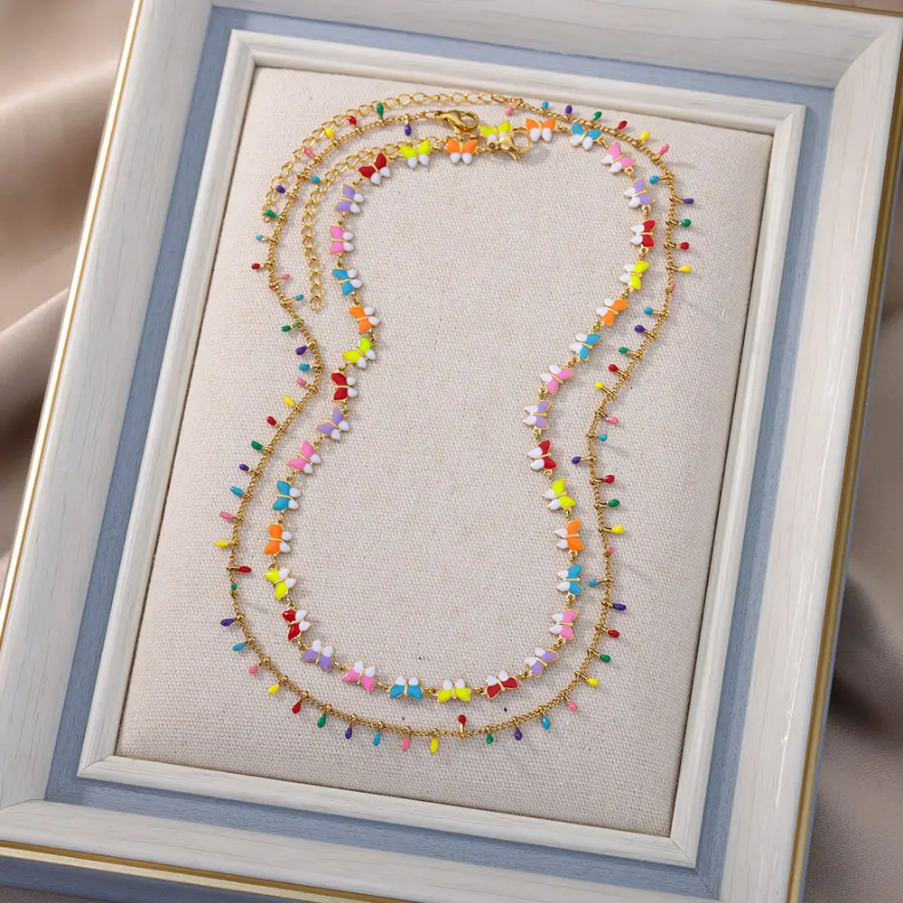 2 Buah Kalung Liontin Kupu-kupu Warna-warni UNTUK WANITA Baja Nirkarat Kalung Manik-manik Beras Pasangan Pernikahan Perhiasan Estetis Kerah
