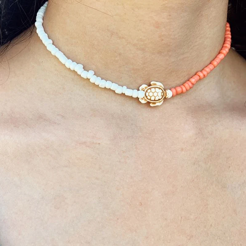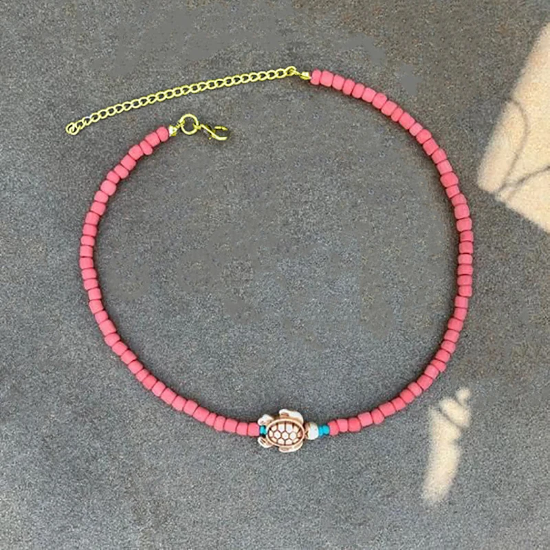 2021 Handmade Cute Turtle Pendant Necklace Watermelon Red Lake Blue Rice Bead Short Jewelry For Women Trendy Exquisite Choker