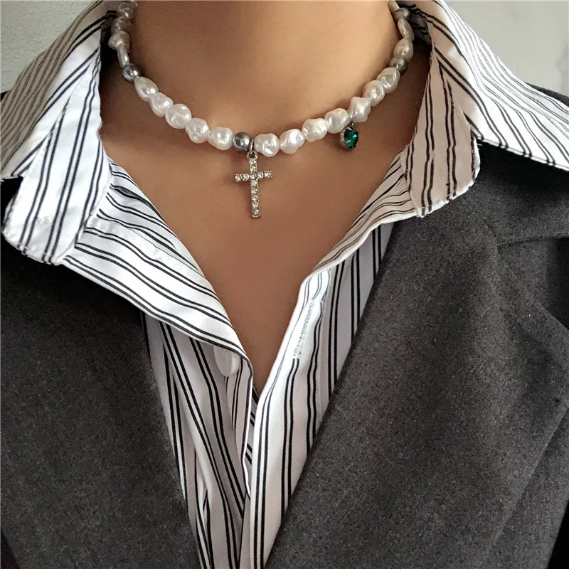 2021 Hip Hop Multi-layer Imitation Irregular Pearls Cross Chain Metal Beads Line Chain Necklace for Women Jewelry