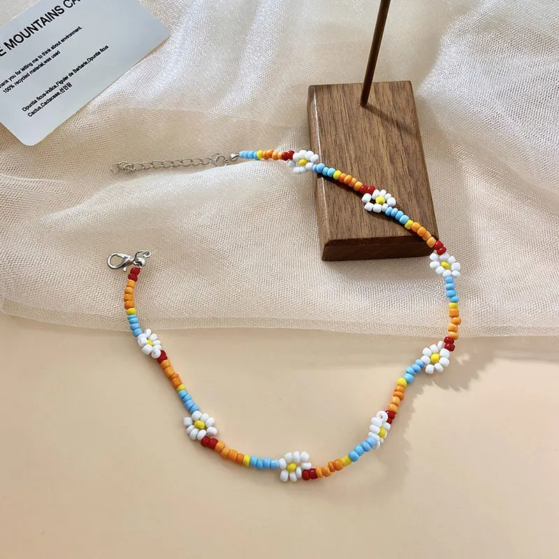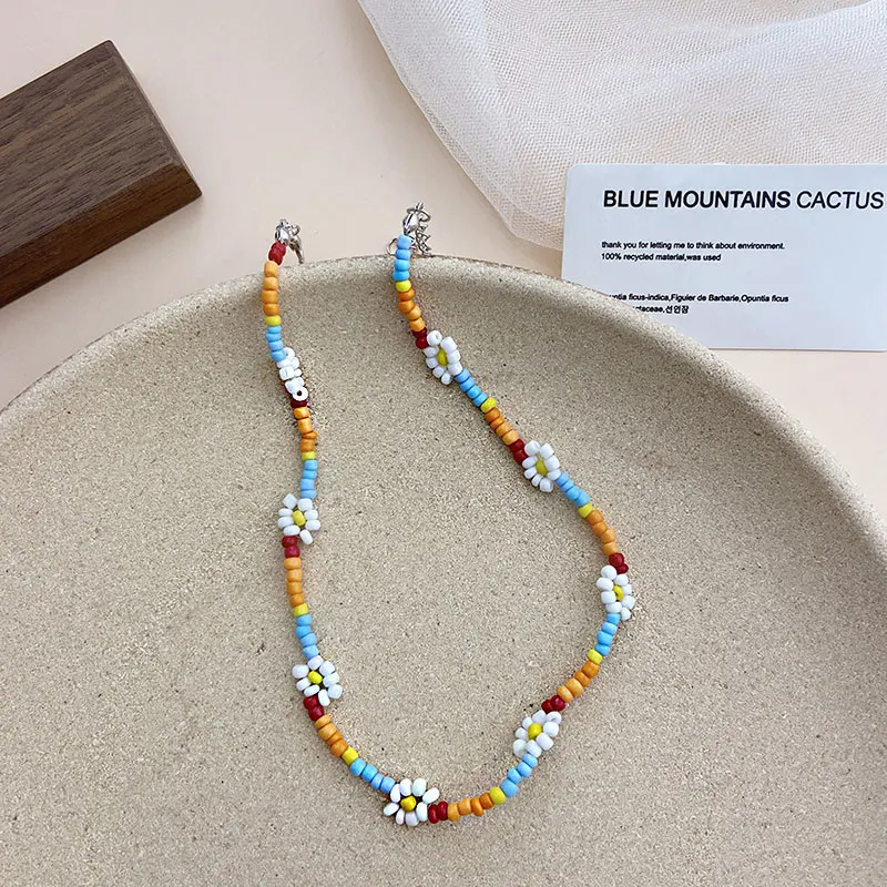 Female Personality Color Beaded Ethnic Style Necklace Creative Rice Bead Woven Flower Geometric Necklace
