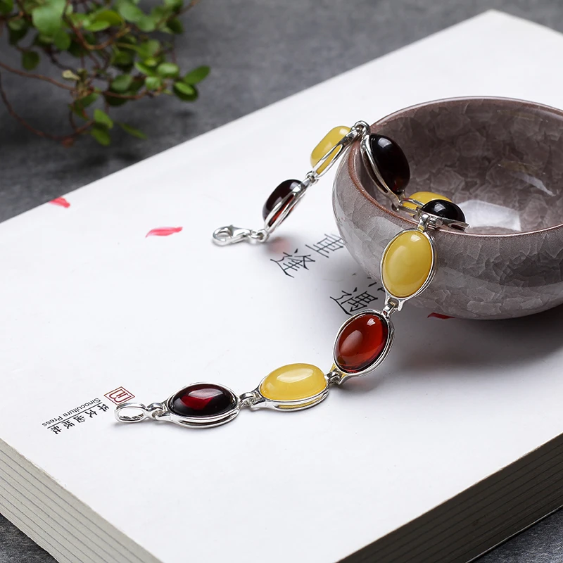 Genuine luxury 925 sterling silver inlaid natural butter yellow old beeswax old amber Bracelets antique European back