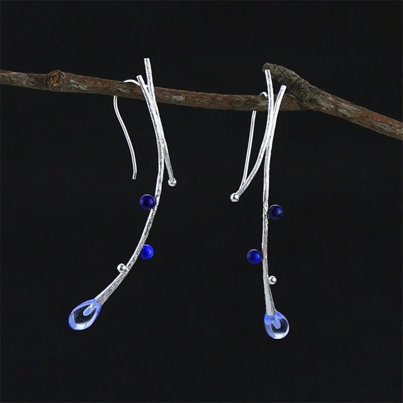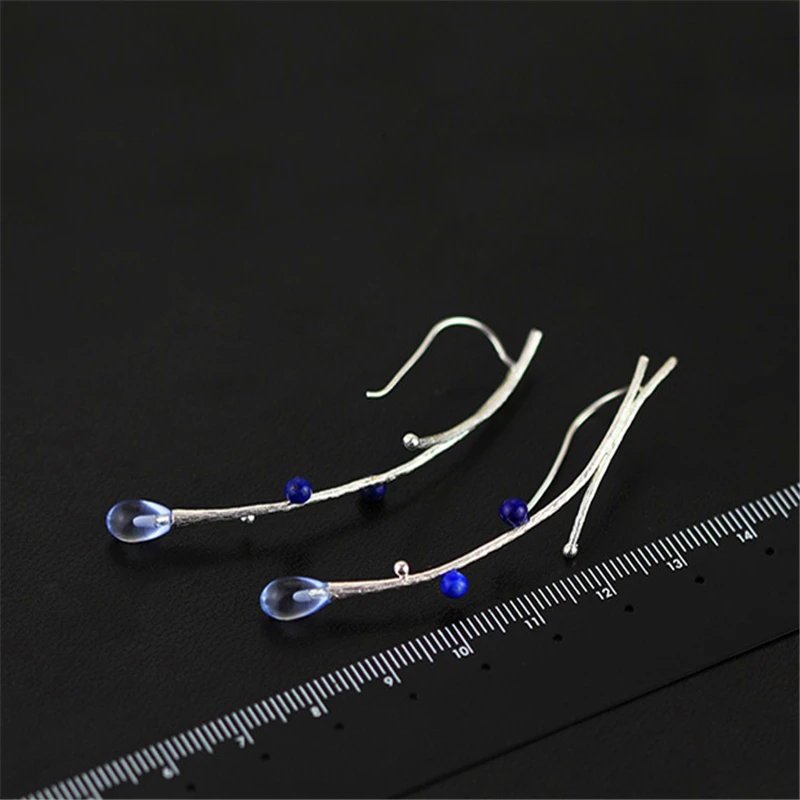 Genuine Sterling Silver 925 Dangle Drop Earring for Women Natural Stone Blue Ball Lapis Water Drop Branch Fine Jewelry