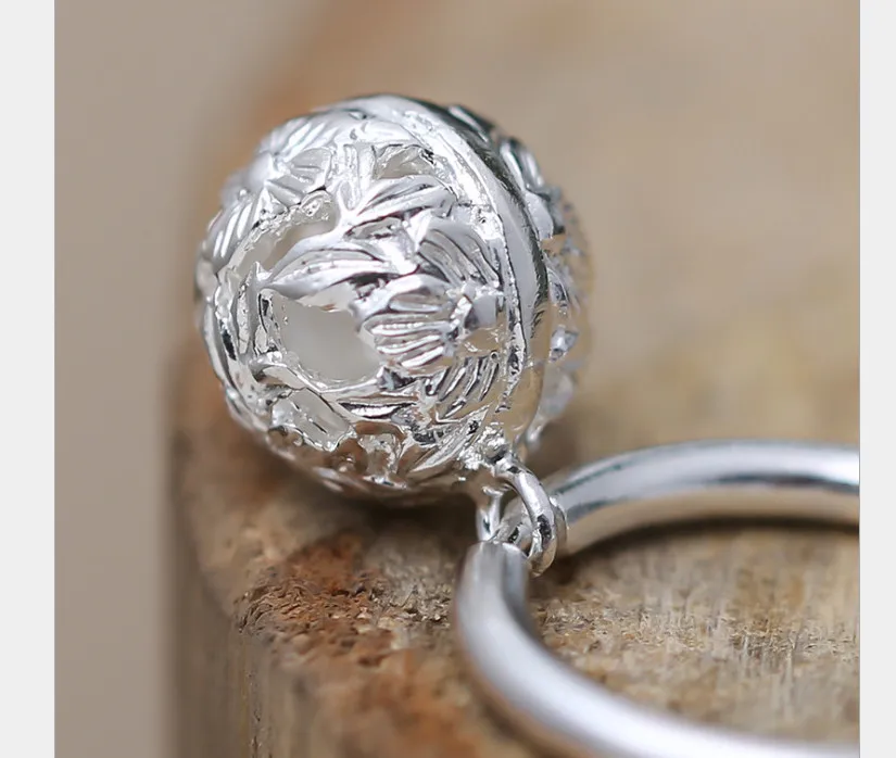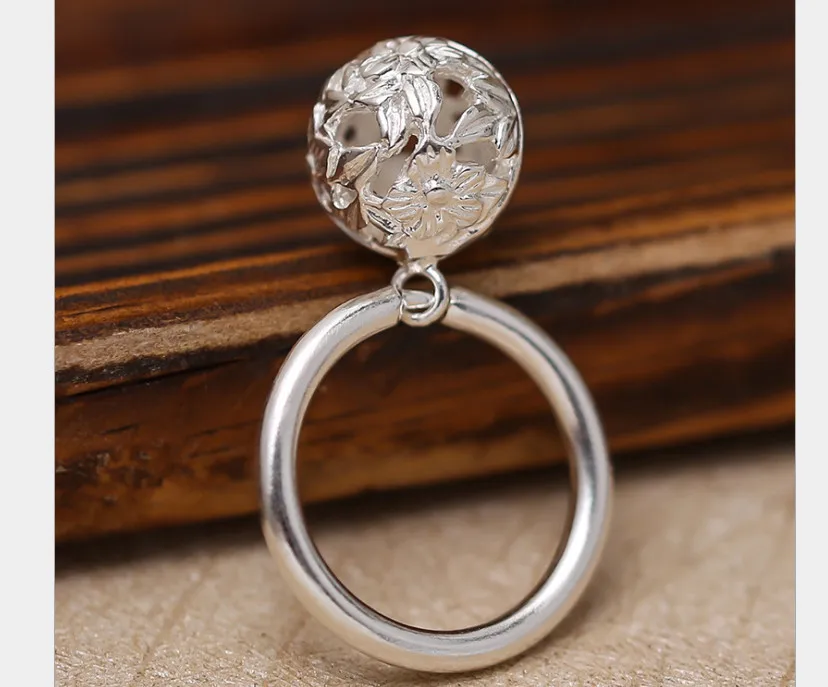 Genuine S 990 Fine Silver Women Dress Jewelry Lovely Ball Charms Finger Ring Flower Hollow Bell Rings Handmade Bijoux