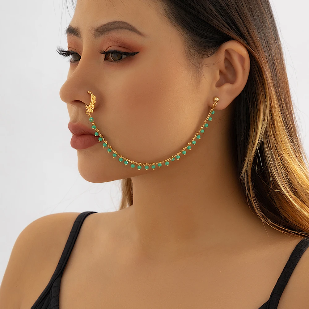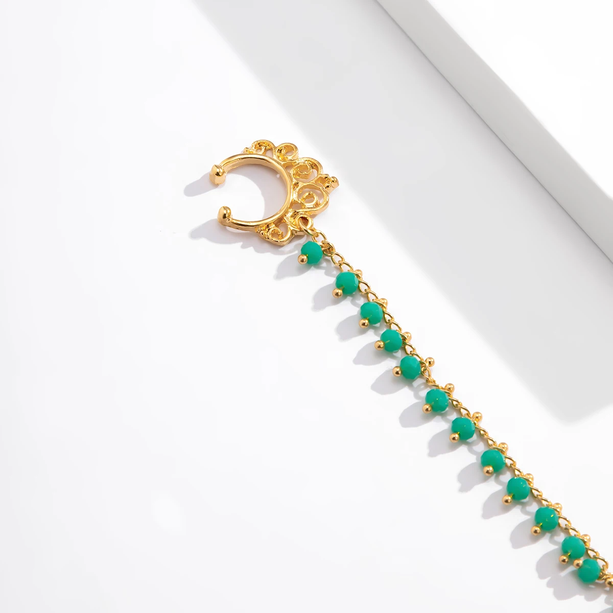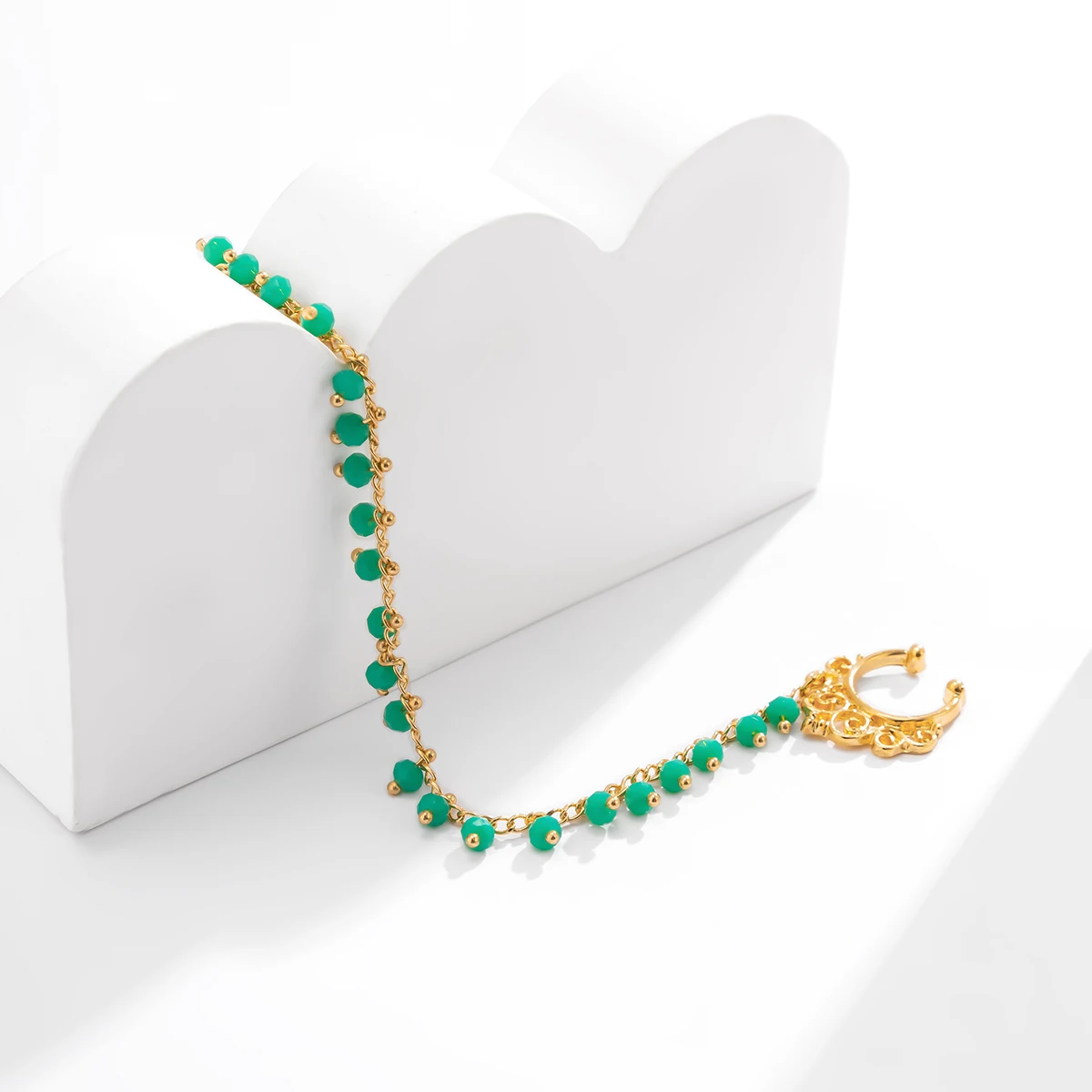 IngeSight.Z 1 pcs Green Beaded Long Dangle Piercing Nose Clip Chain for Women Hollow Metal Copper Chain Ear Cuffs Body Jewelry