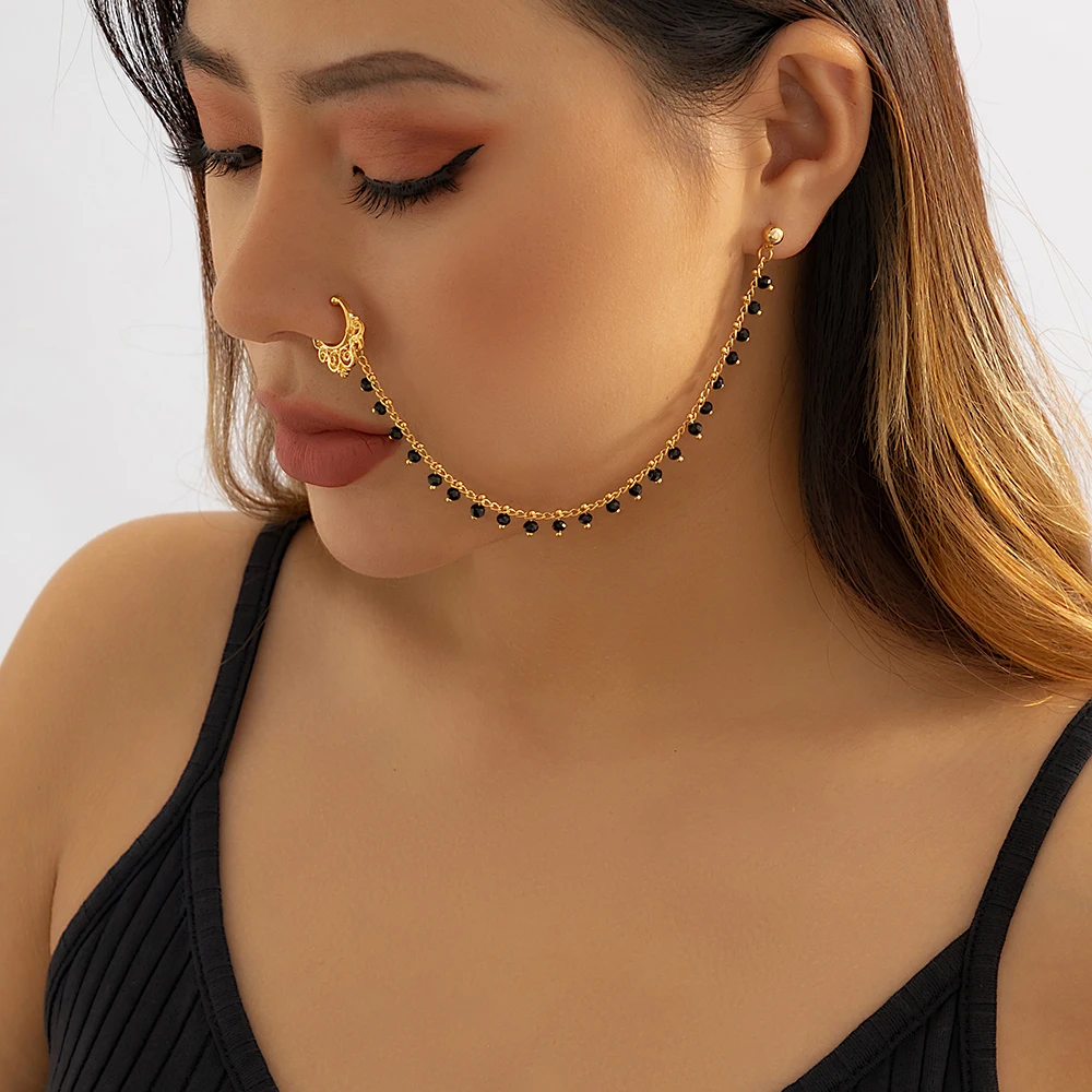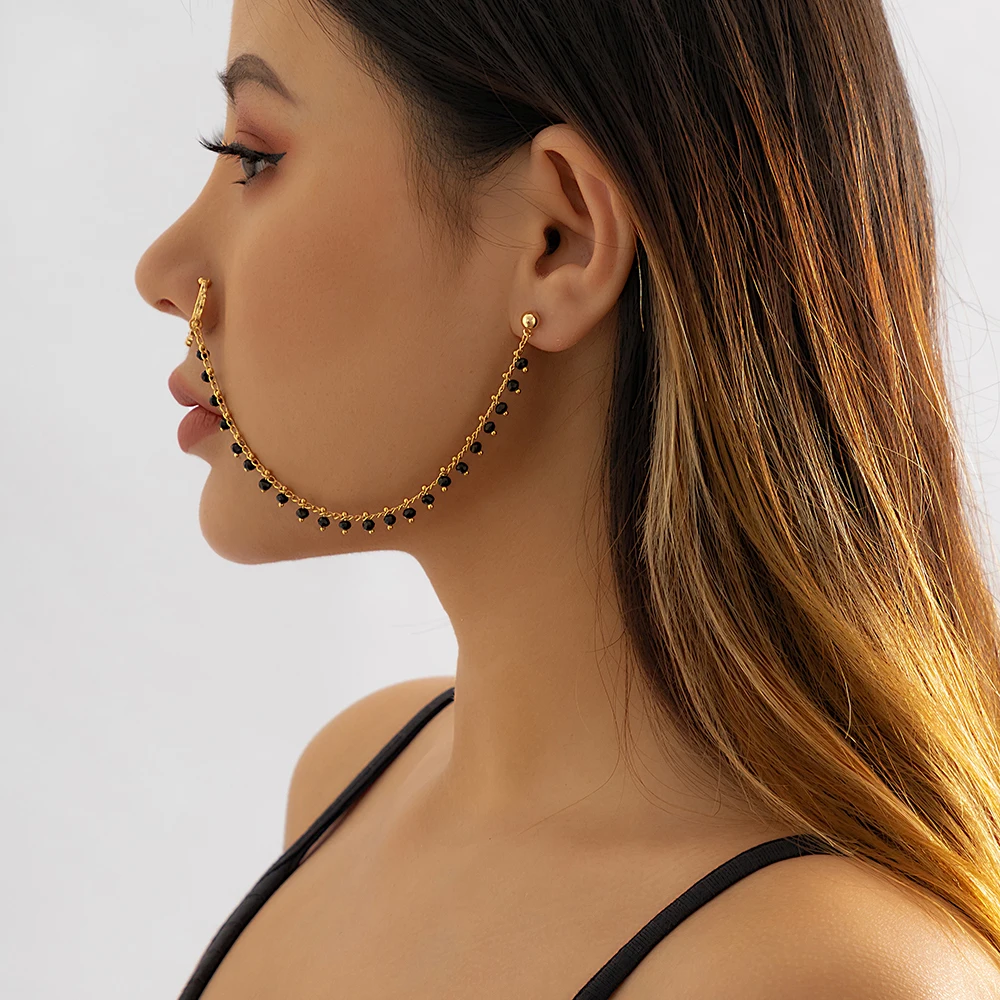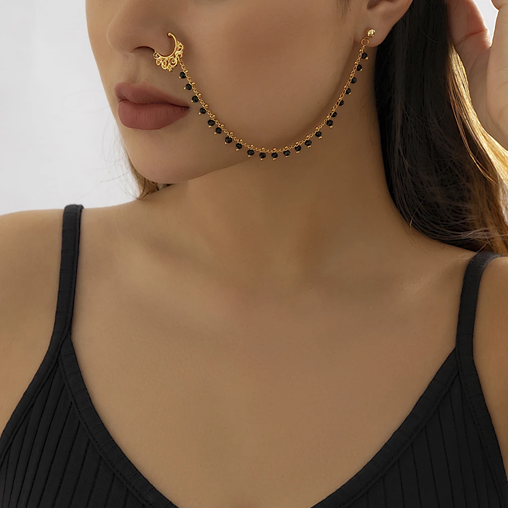 IngeSight.Z 1 pcs Green Beaded Long Dangle Piercing Nose Clip Chain for Women Hollow Metal Copper Chain Ear Cuffs Body Jewelry