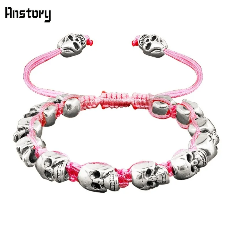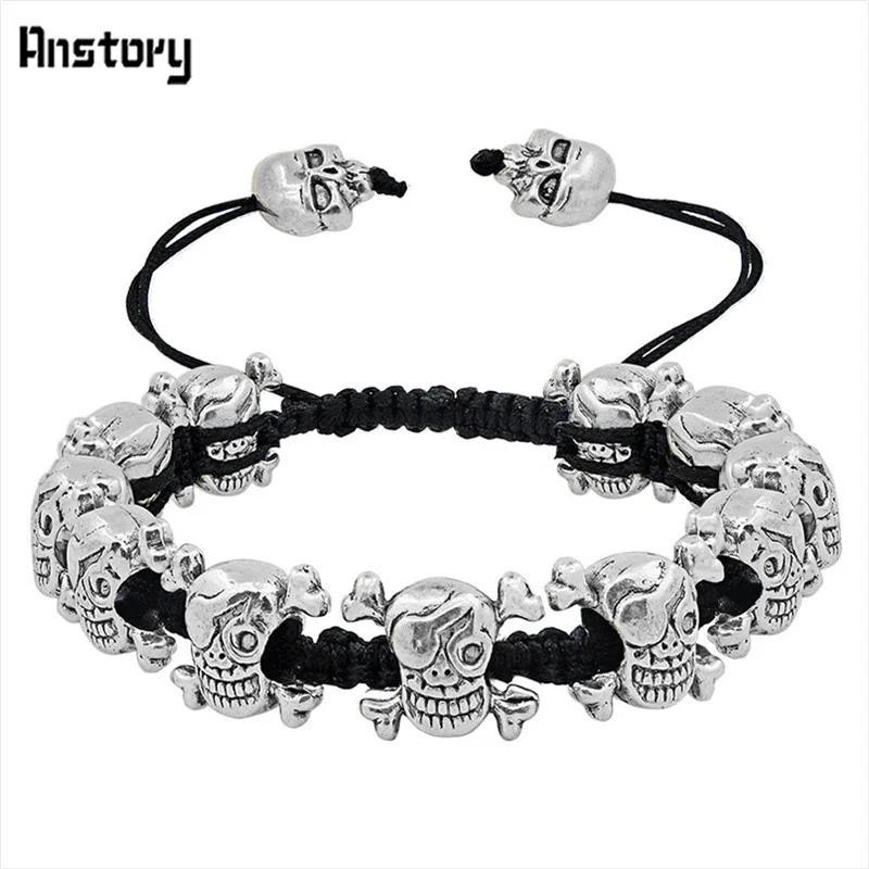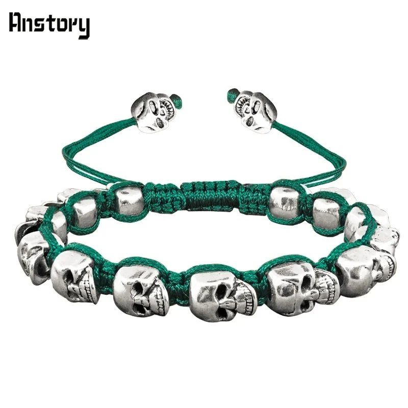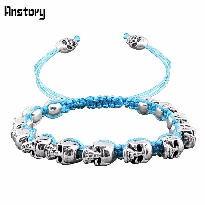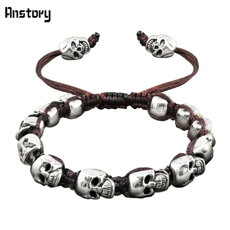 Smile Skull Skeleton Bead Bracelets Strand Vintage Boho Antique Silver Plated Handmade Rope Woven Craft Fashion Jewelry