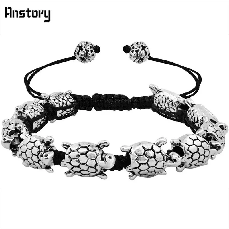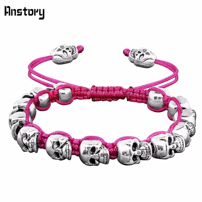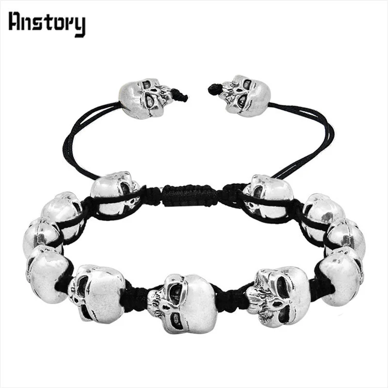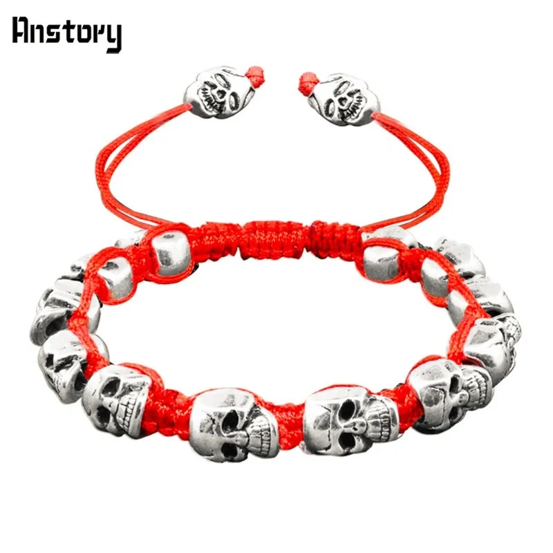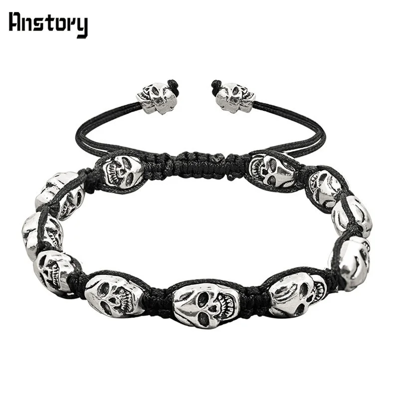 Smile Skull Skeleton Bead Bracelets Strand Vintage Boho Antique Silver Plated Handmade Rope Woven Craft Fashion Jewelry