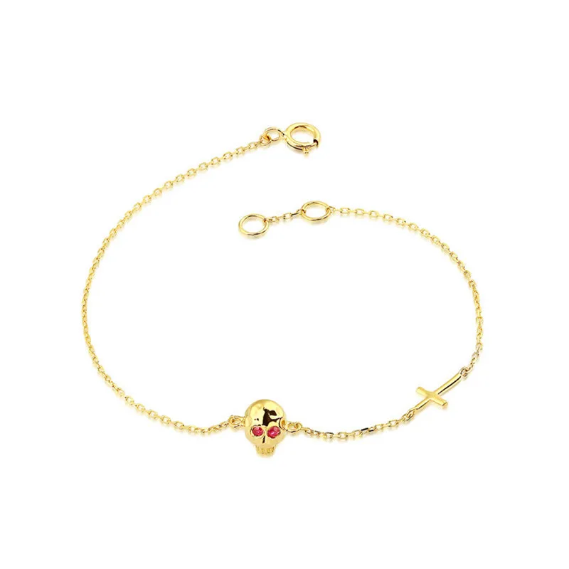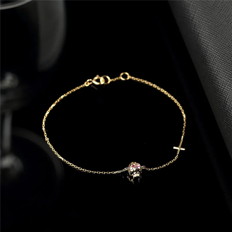 18K Real Pure Gold Skull Skeleton Bracelet Natural Ruby Eyes Jesus Christian Cross Rock Bracelet Link Chain Bracelet