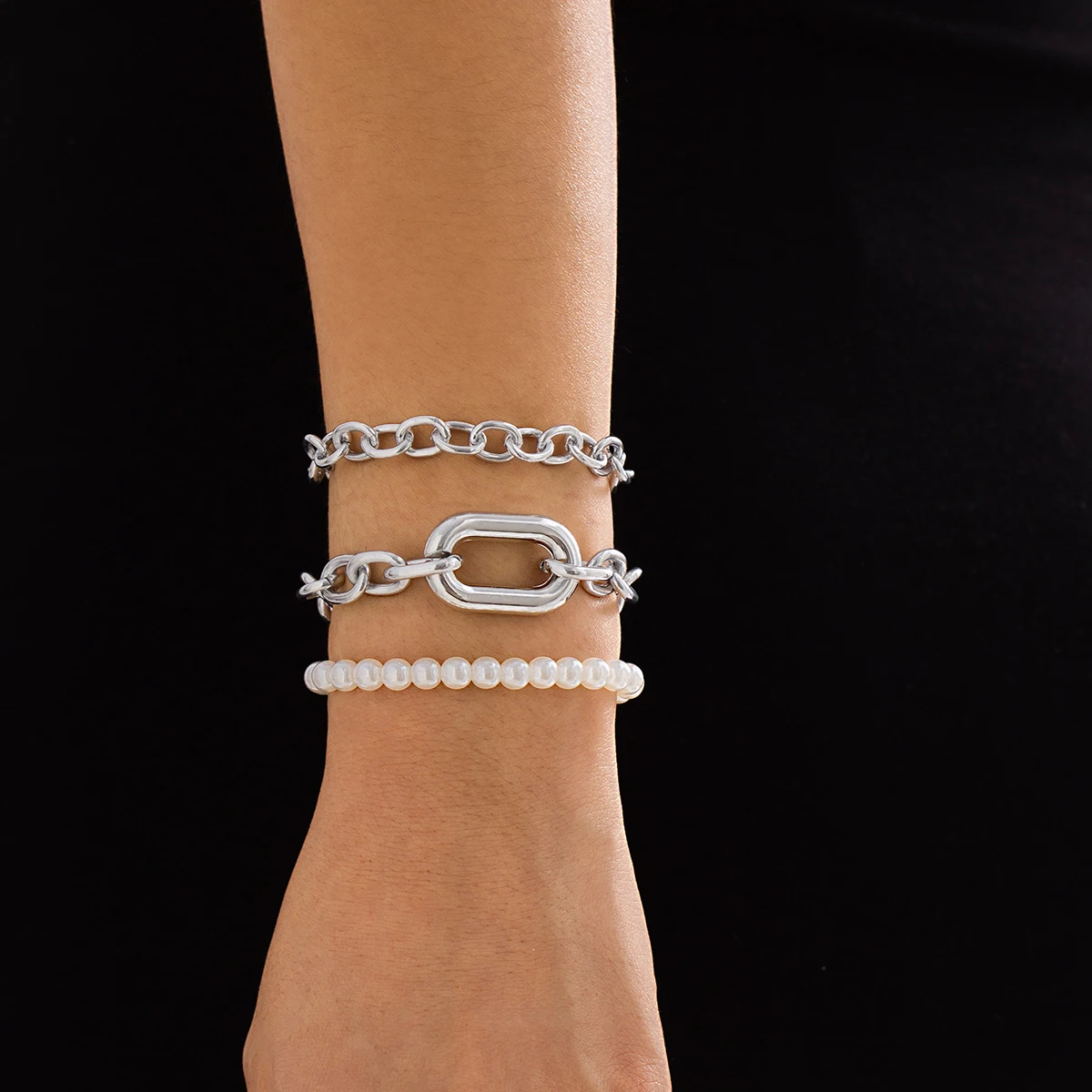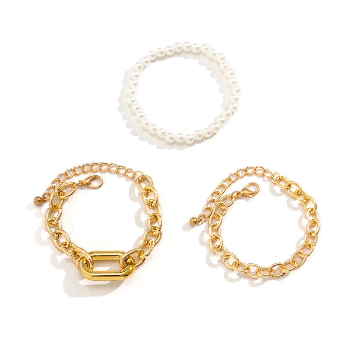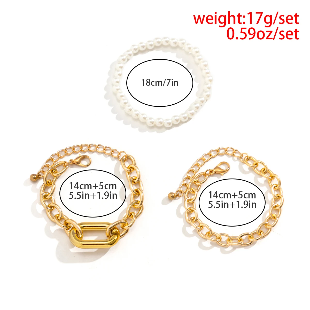 IngeSight.Z 3pcs/set Punk Pearl Beaded Metal Thick Chain Bracelets for Women Gold Color O Shape Charm Cuban Bracelet Bangle