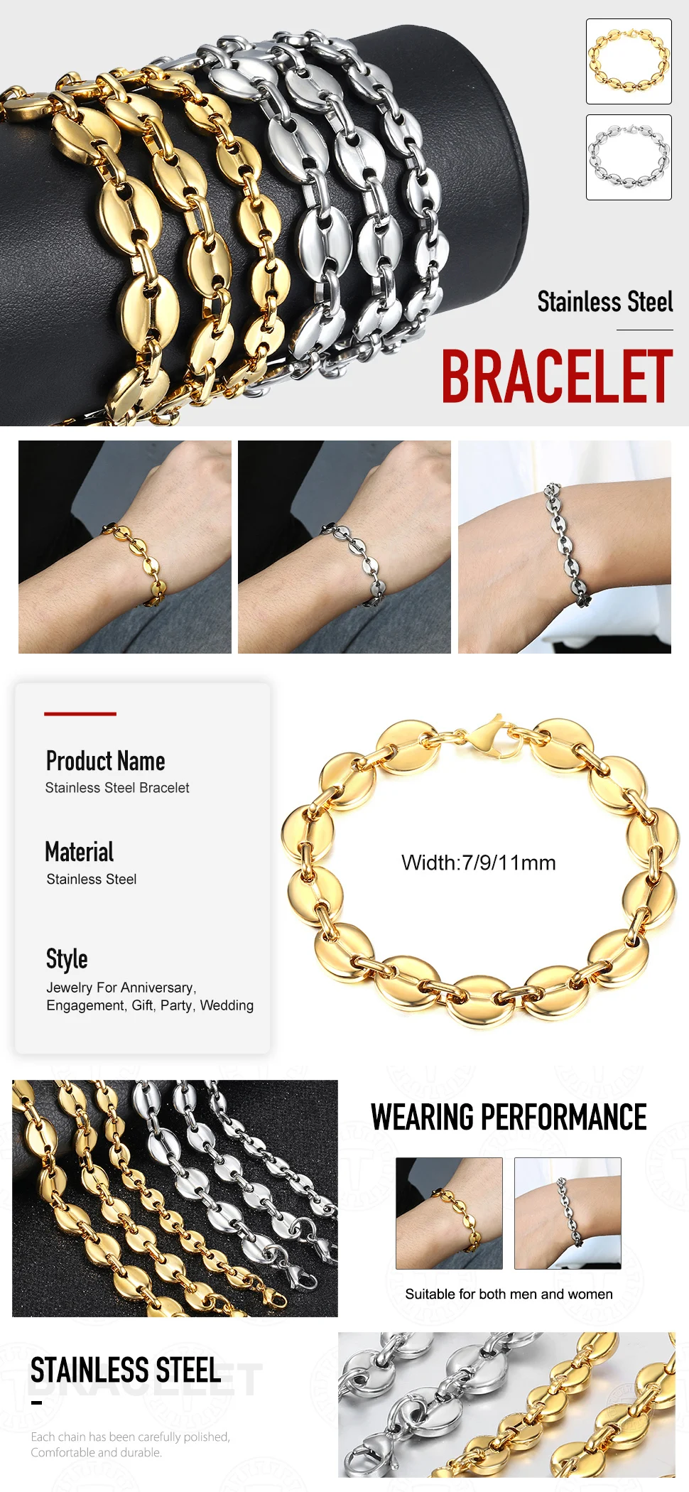 Stainless Steel Coffee Beans Marina Link Chain Bracelet for Men Women Hip Pop Homme Jewelry Gifts Trendy 7/9/11mm KBM169