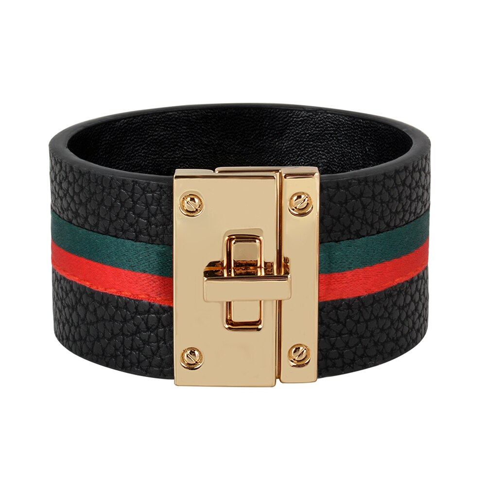 Kirykle Women Cuff Leather Bracelets Red Green Ribbon Bangles Simple Steel Lock Design Wide Charm Bracelets Punk Female Jewelry