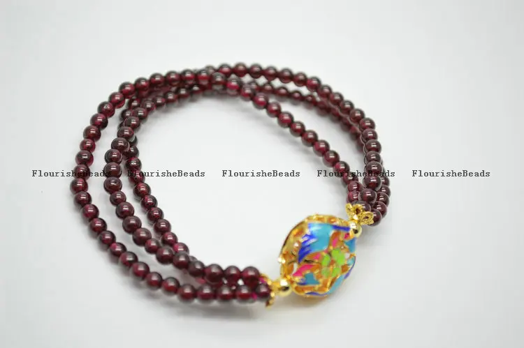 Multi Rows Natural Garnet Stone Round Beads Metal Round Coin Cloisonne Enamel Charm Bracelet Fashion Woman Party Jewelry