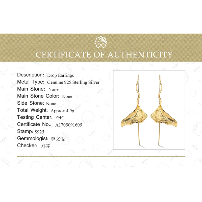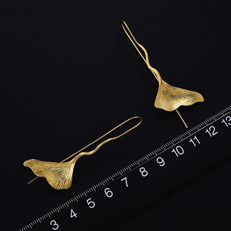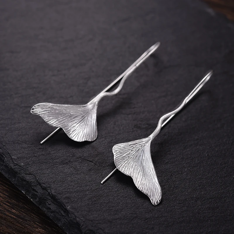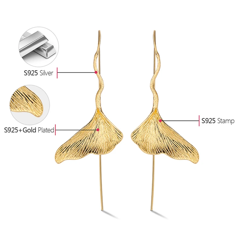 Real 925 Sterling Silver Natural Handmade Designer Fine Jewelry Vintage Ginkgo Leaf Drop Earrings for Women Brincos