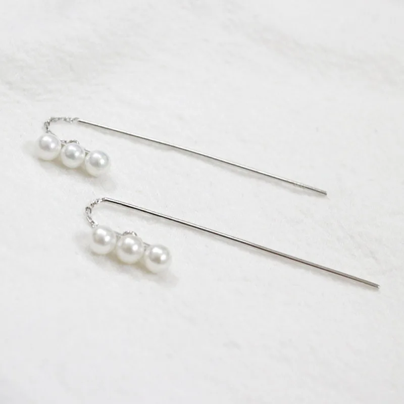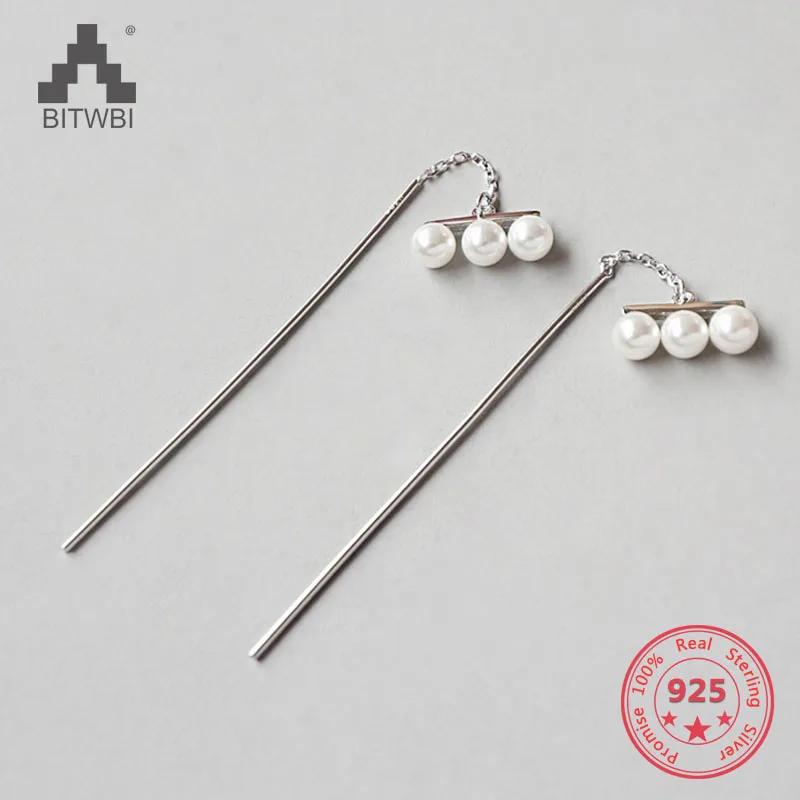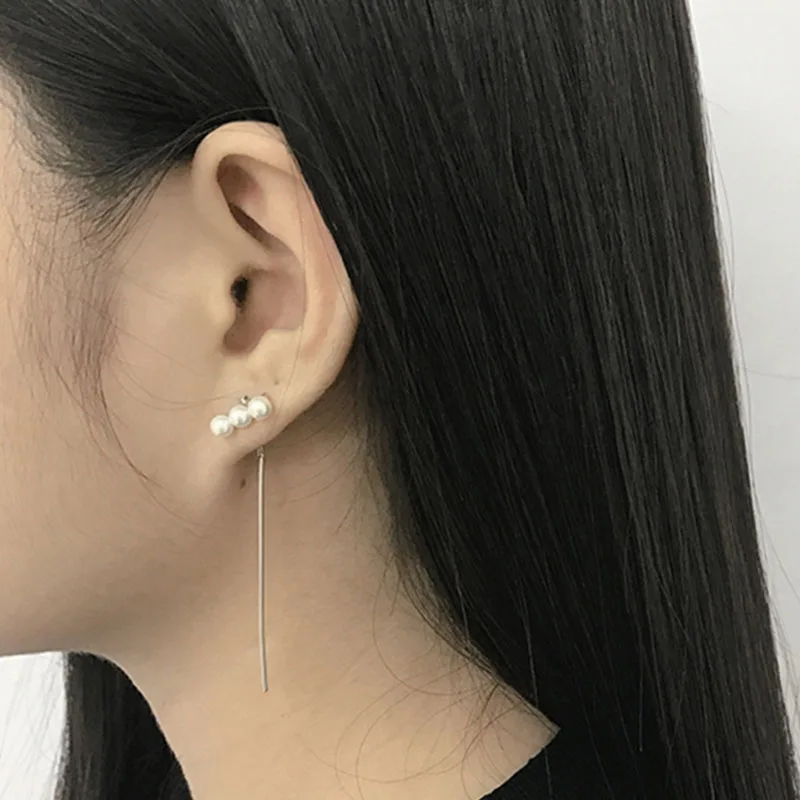 100% S925 Sterling Silver CHIC Pearl Geometric Long Strip Tassel Earrings