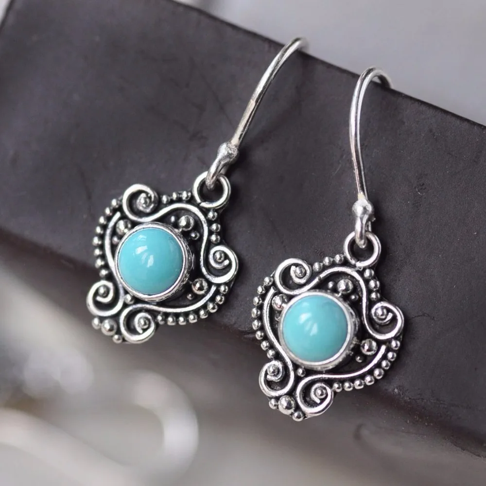 2020 Ethnic Real 925 Sterling Silver Drop Earrings For Women Girl Original Handmade Natural Turquoise Lace Earrings Fine Jewelry