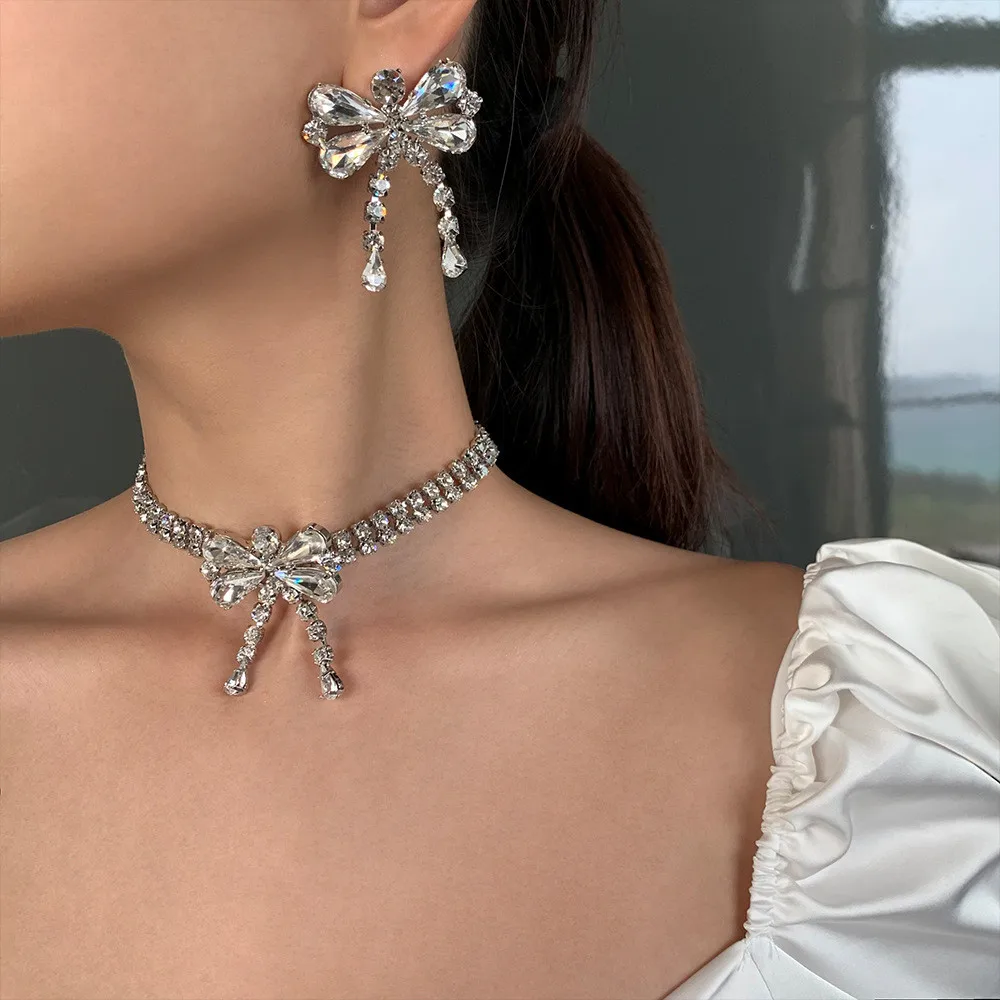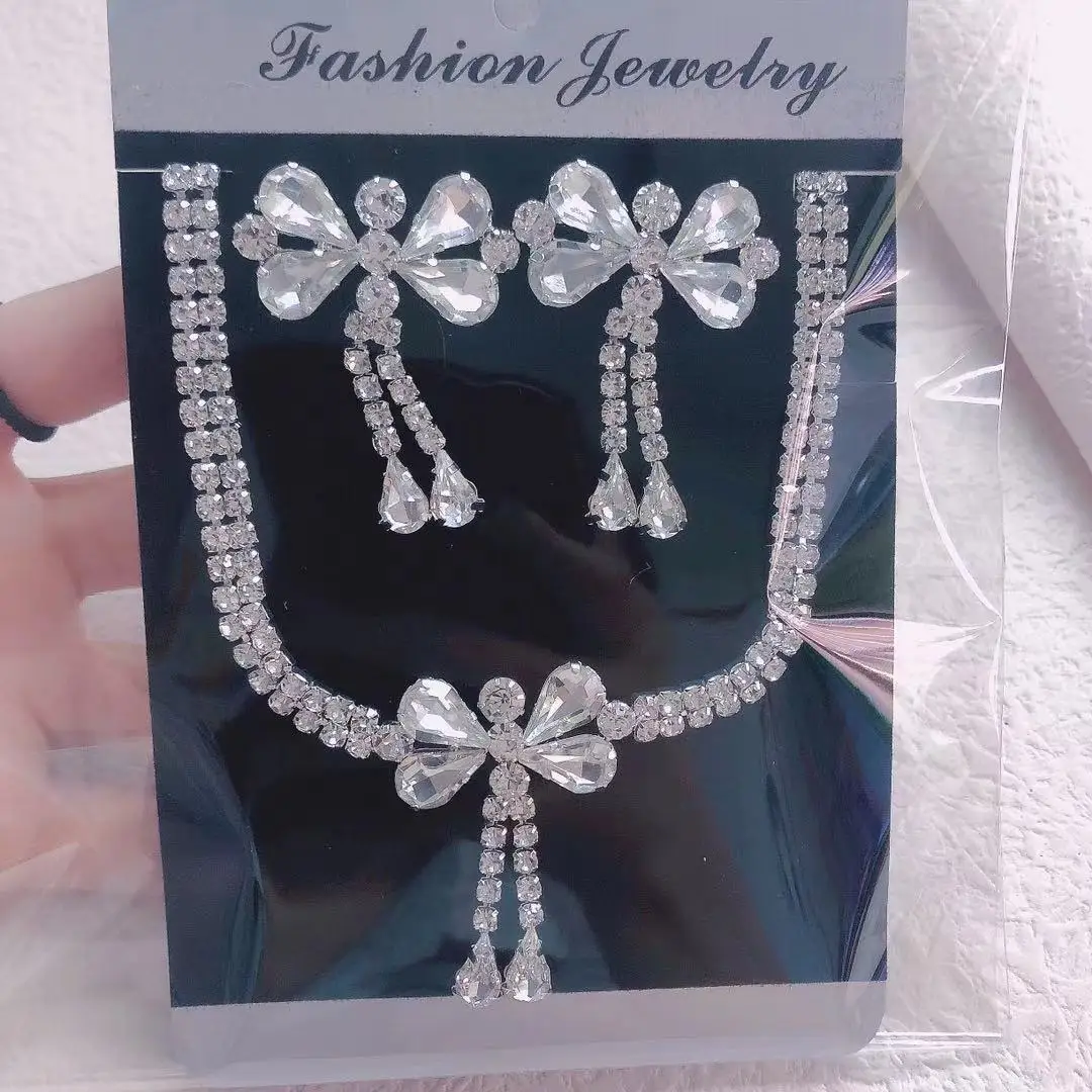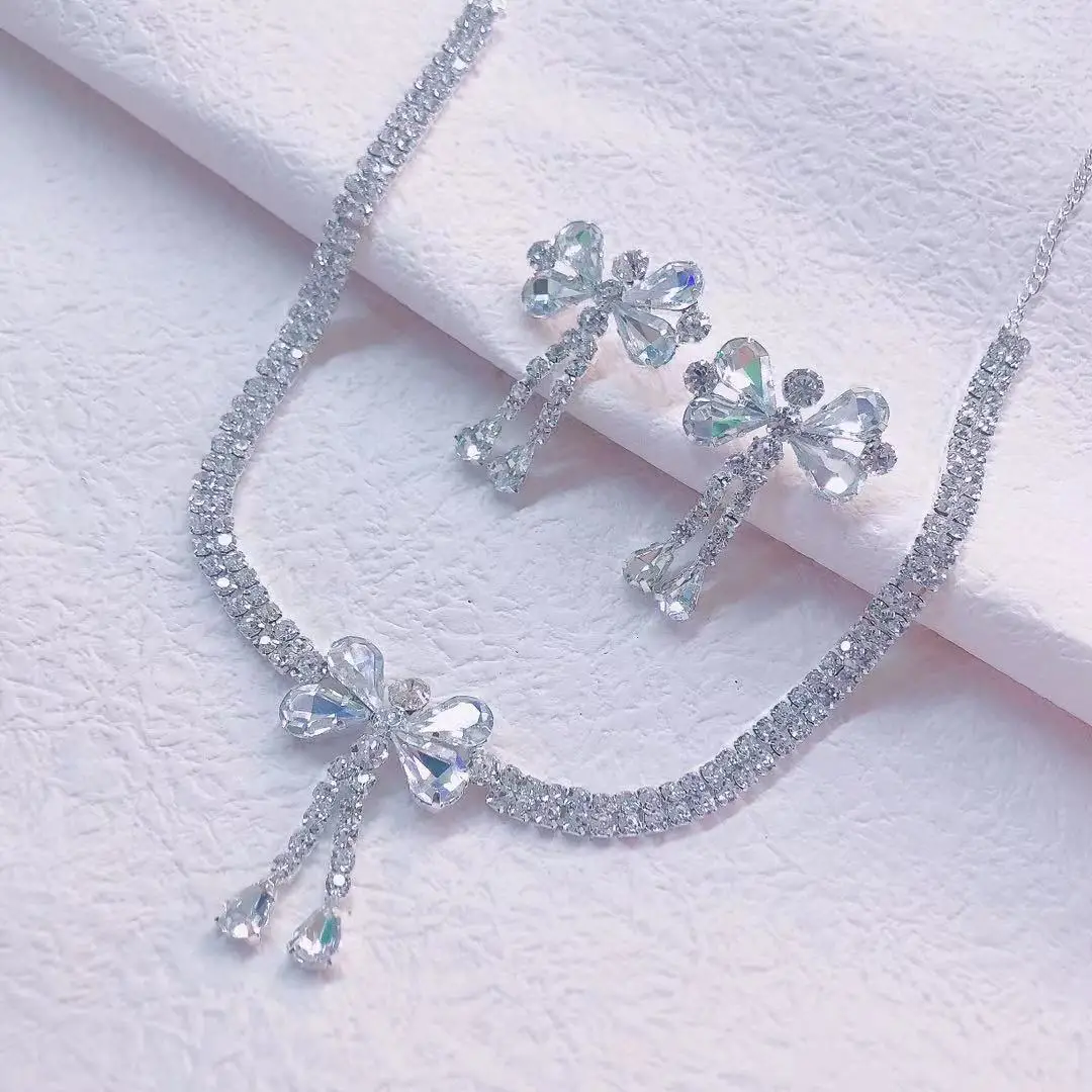 2021 korea sweet bow Crystal Pendant Earring Necklace Set women's double row Water Drop Pendant Necklace Party Jewelry