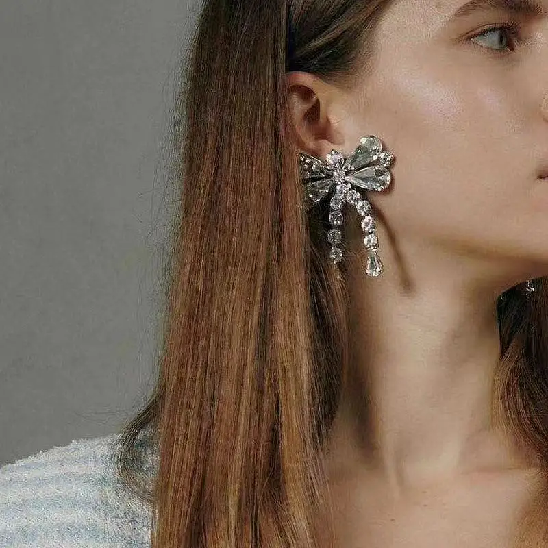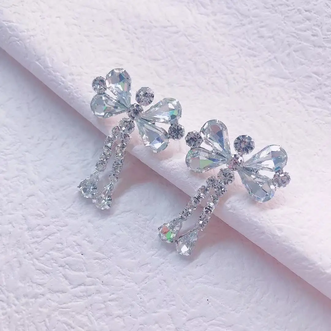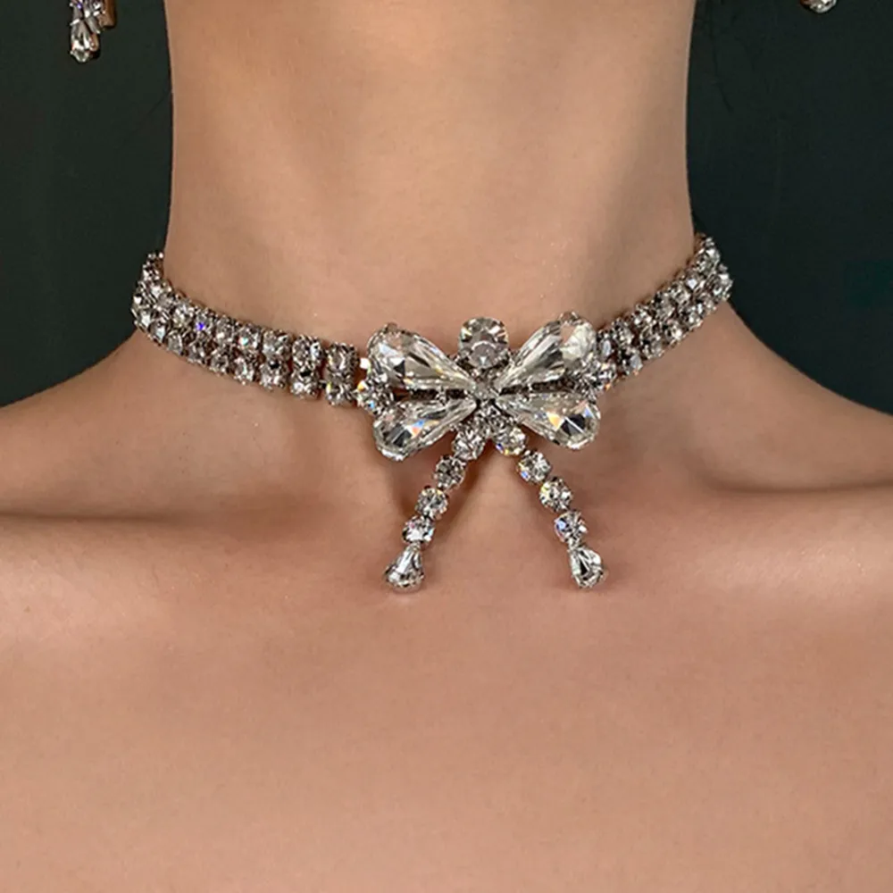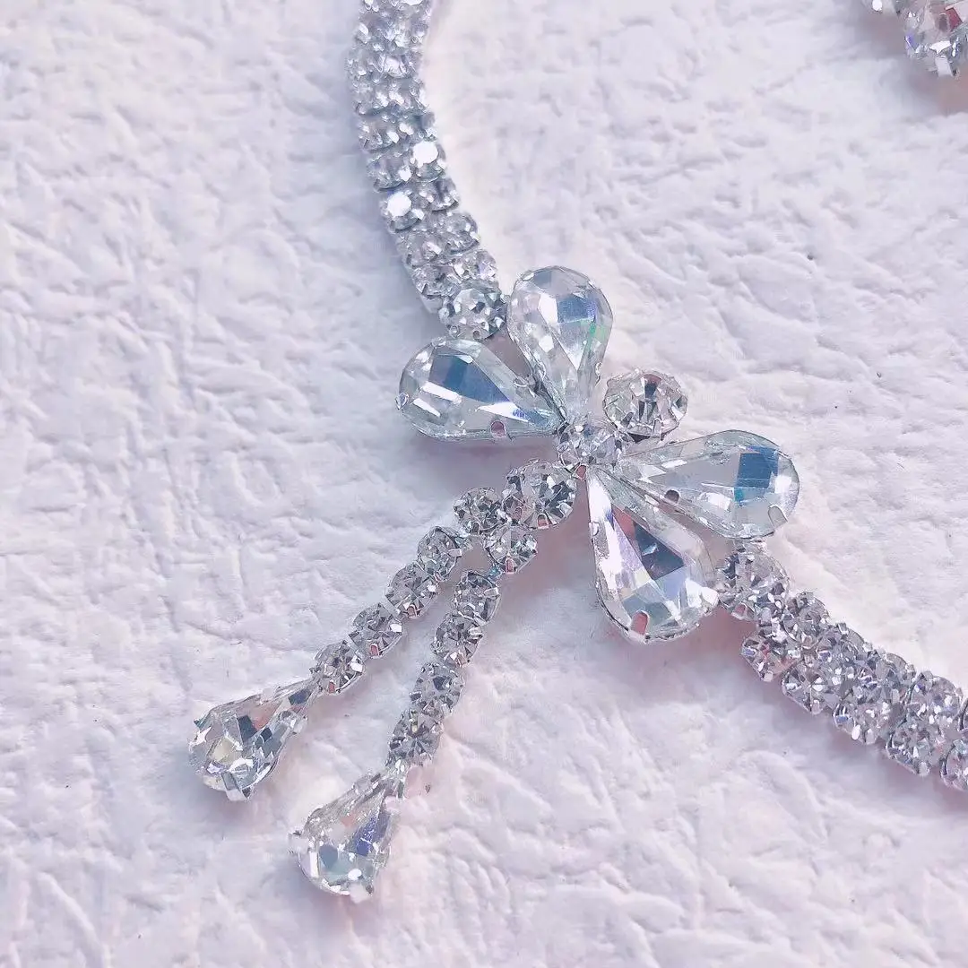 2021 korea sweet bow Crystal Pendant Earring Necklace Set women's double row Water Drop Pendant Necklace Party Jewelry