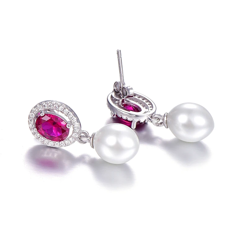 3.8ct 100% 925 Sterling Silver Earrings Oval Cut ruby red earrings Cz Fresh Water Pearl Elegant silver earring drop bijoux