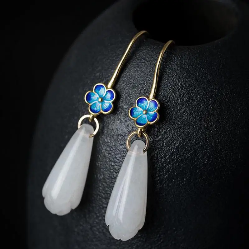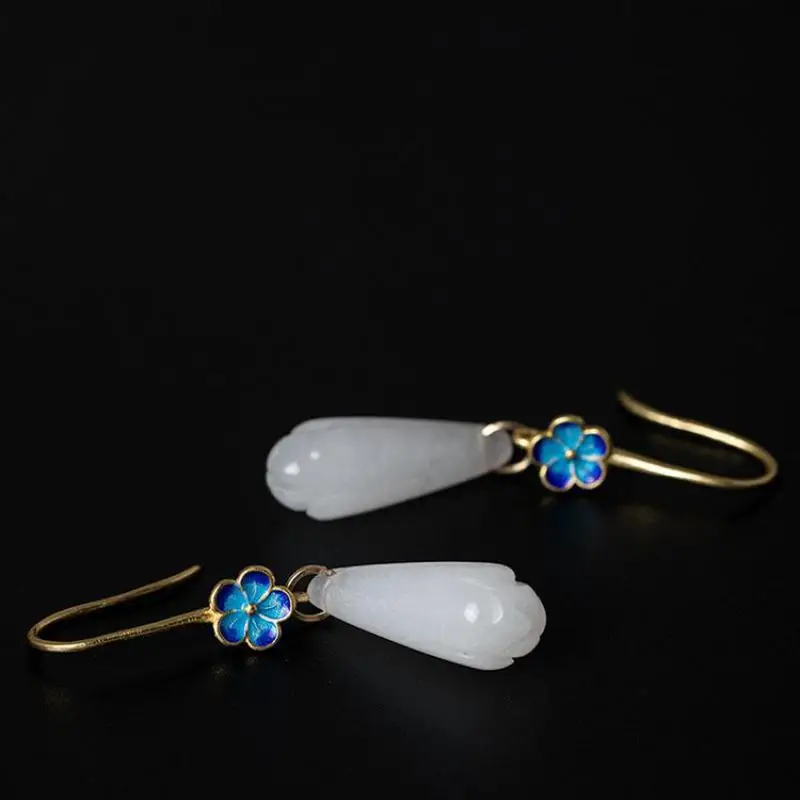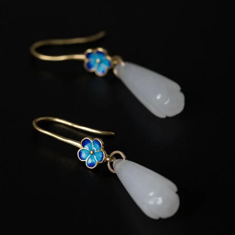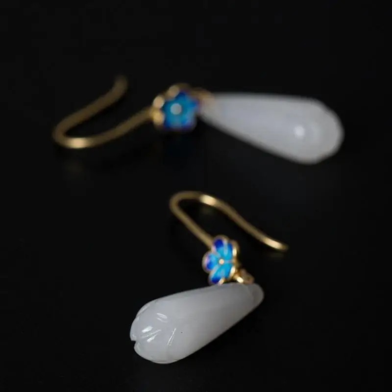 925 Sterling Silver Dangle Magnolia Flower Earrings For Women Natural White Jade Stone Handmade Enamel Process High Quality