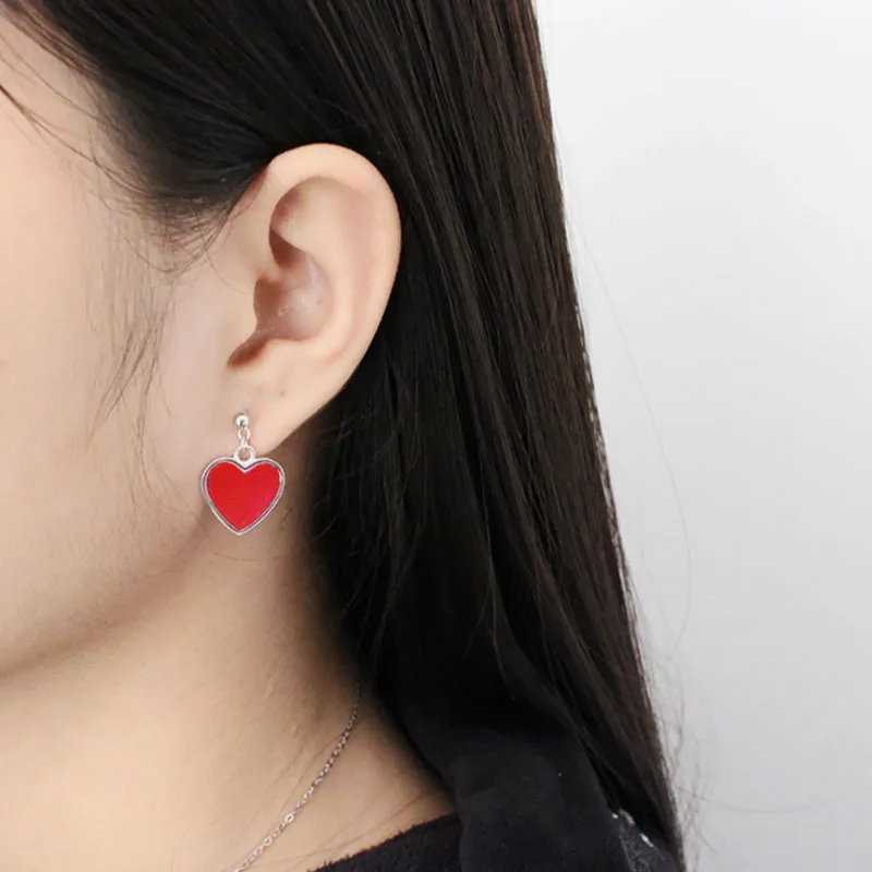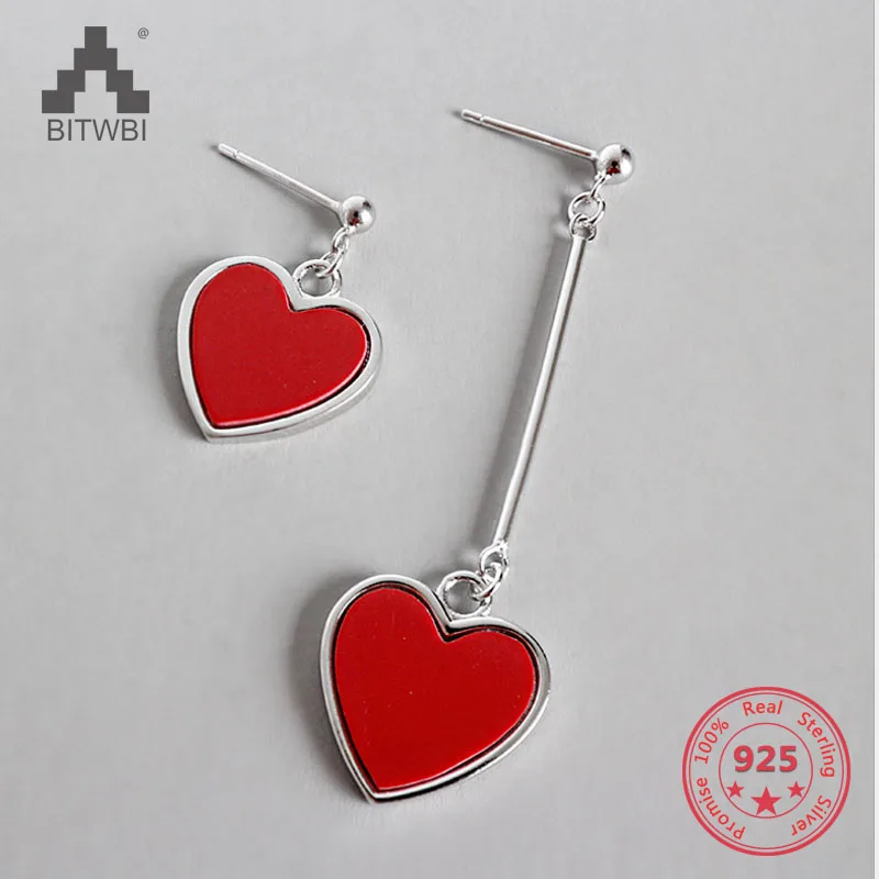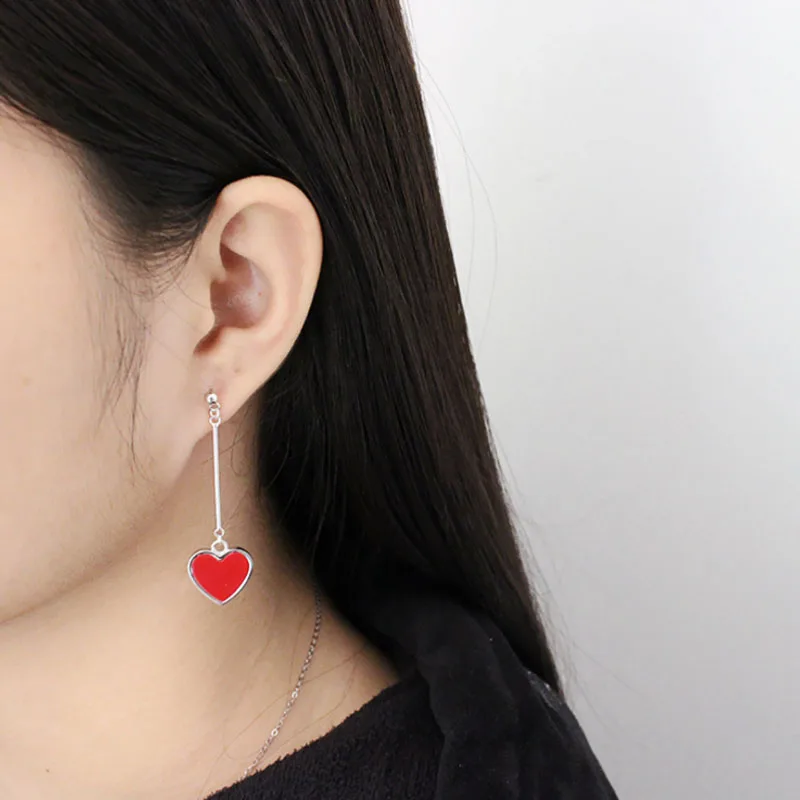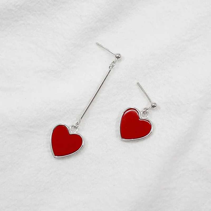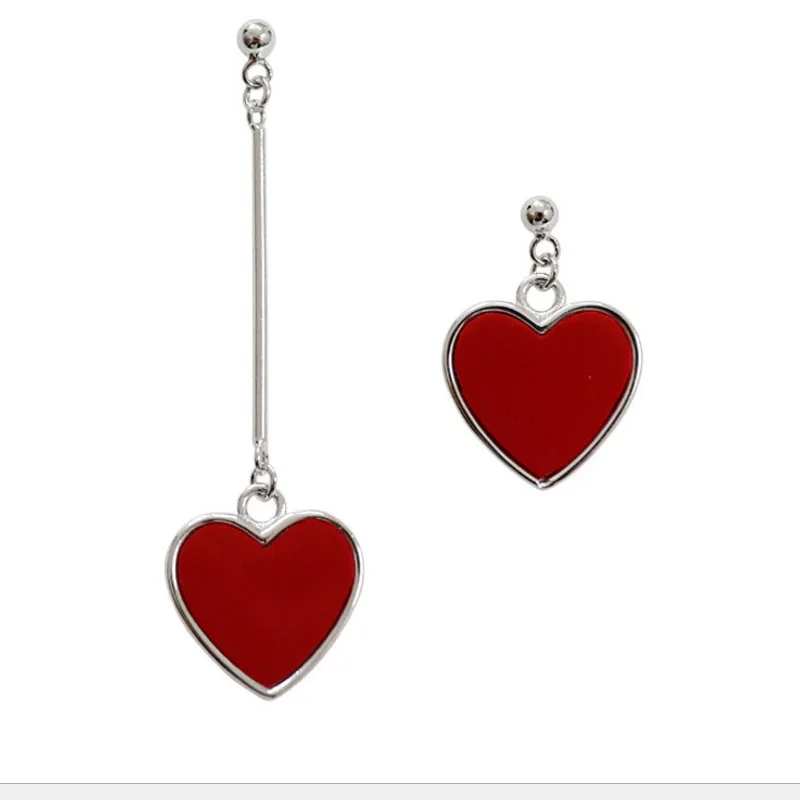 925 Sterling Silver Jewelry Red Heart-shaped Asymmetric Earrings for Women