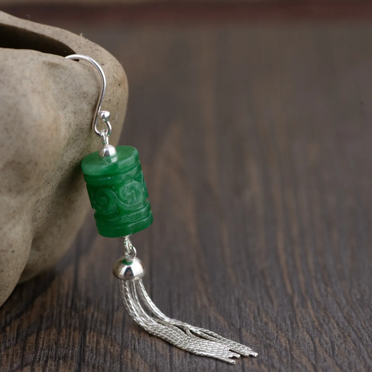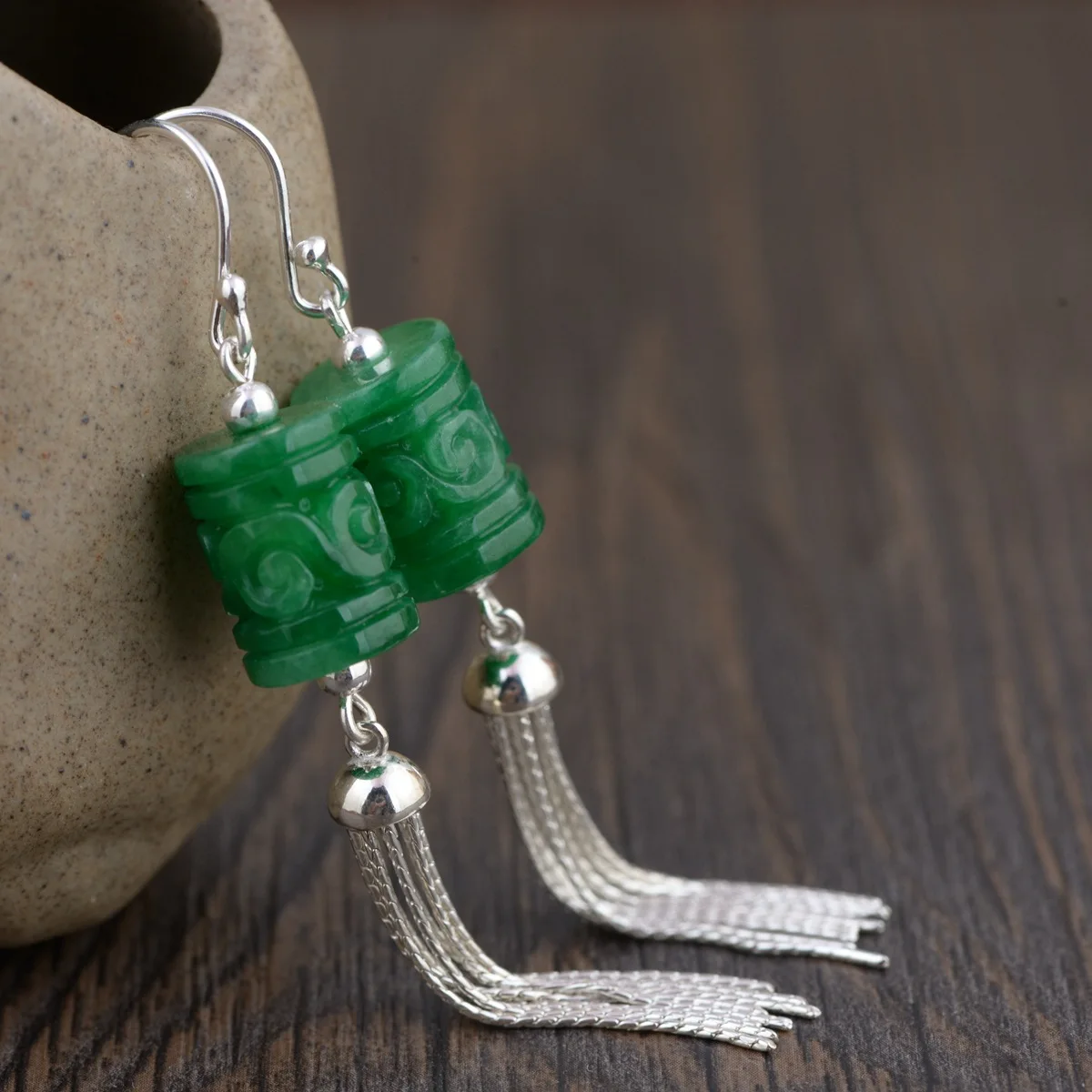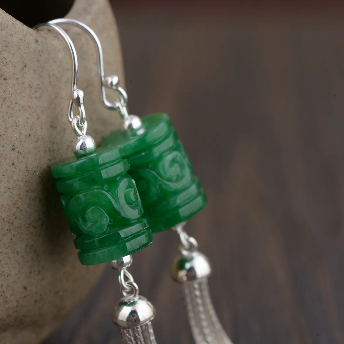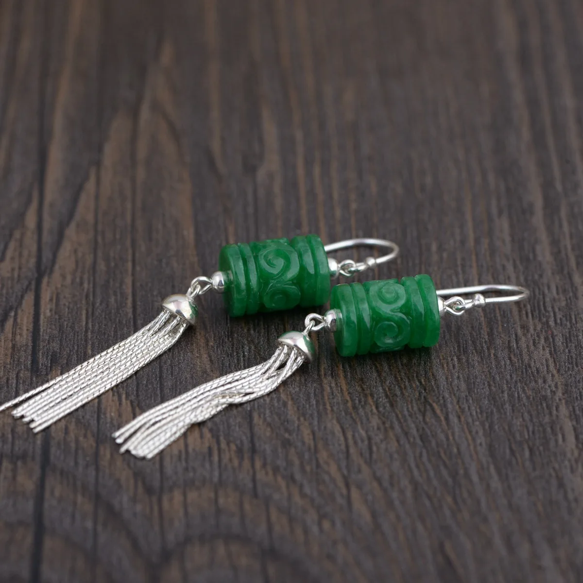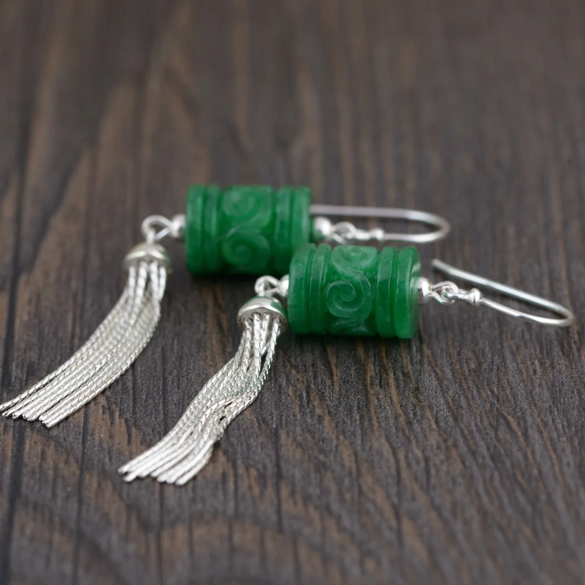 925 Sterling Silver Long Tassel Drop Earrings With Hook For Women Natural Green Jade Cylinder Shaped Flower Engraved