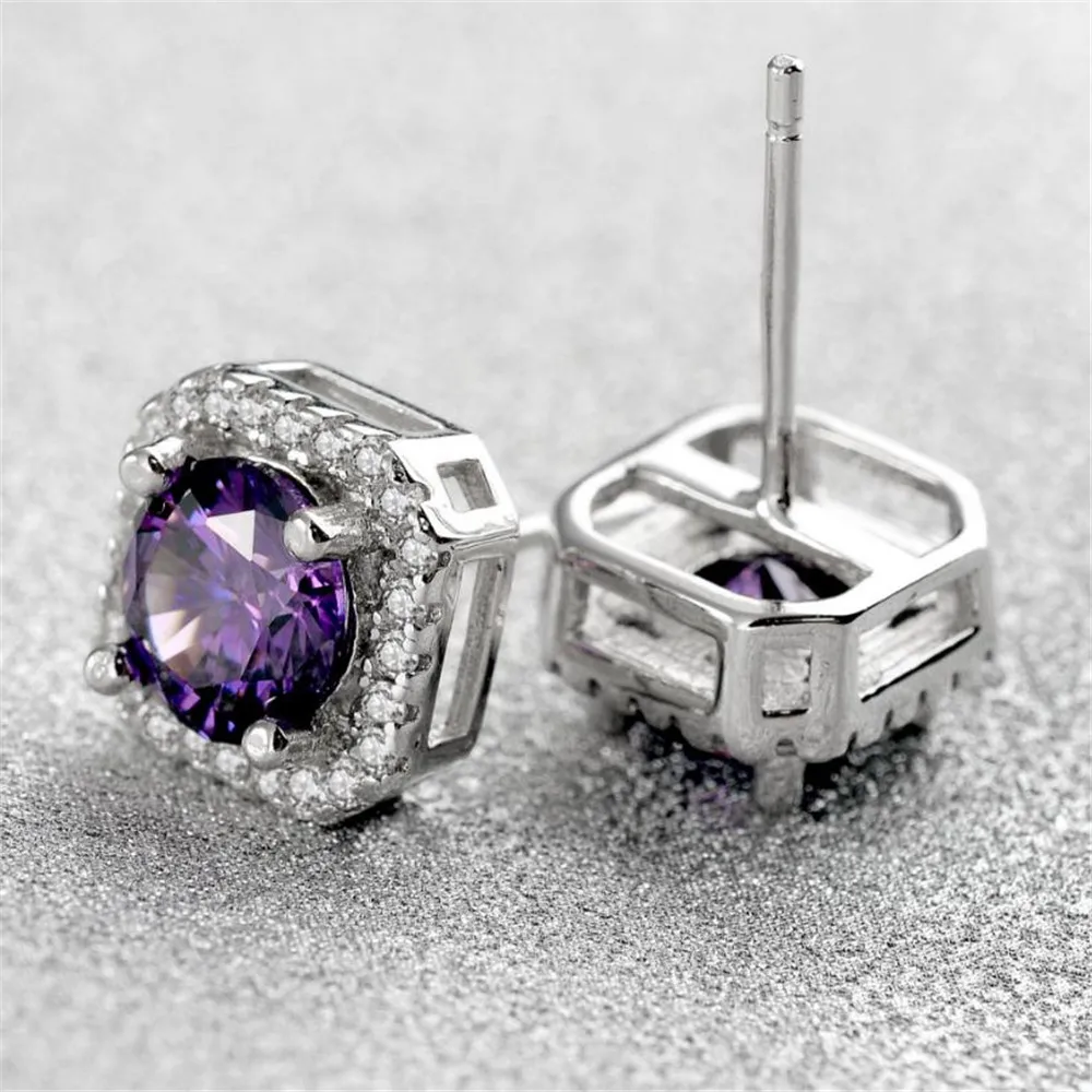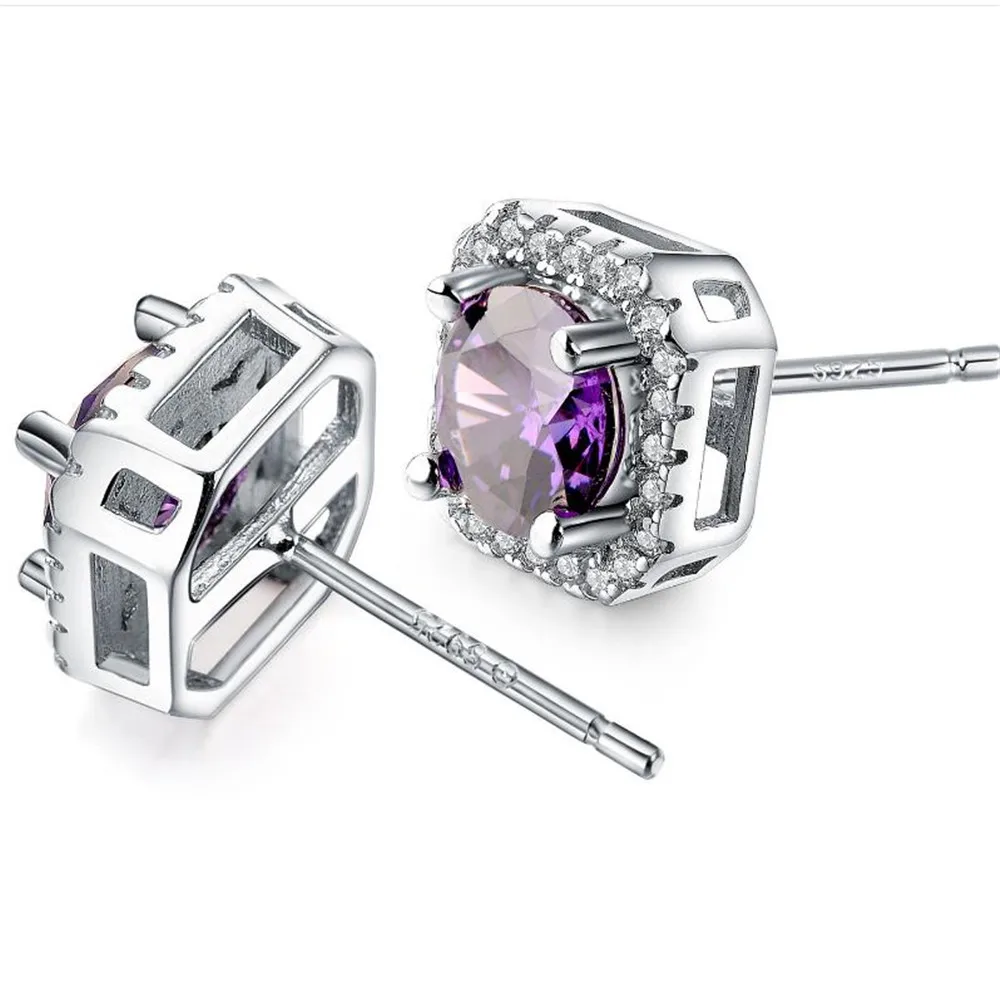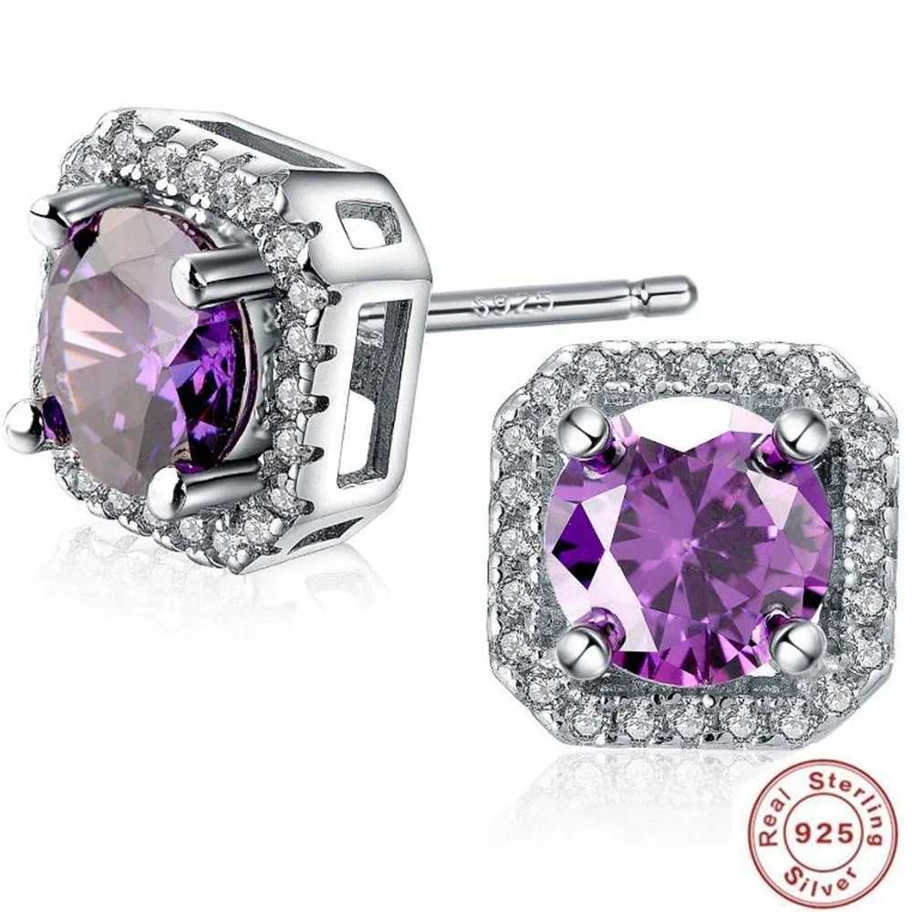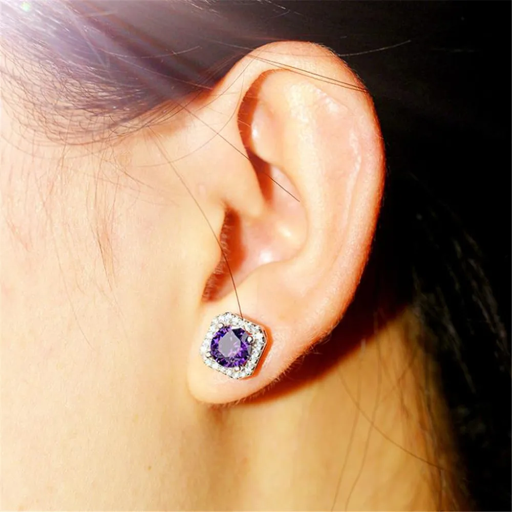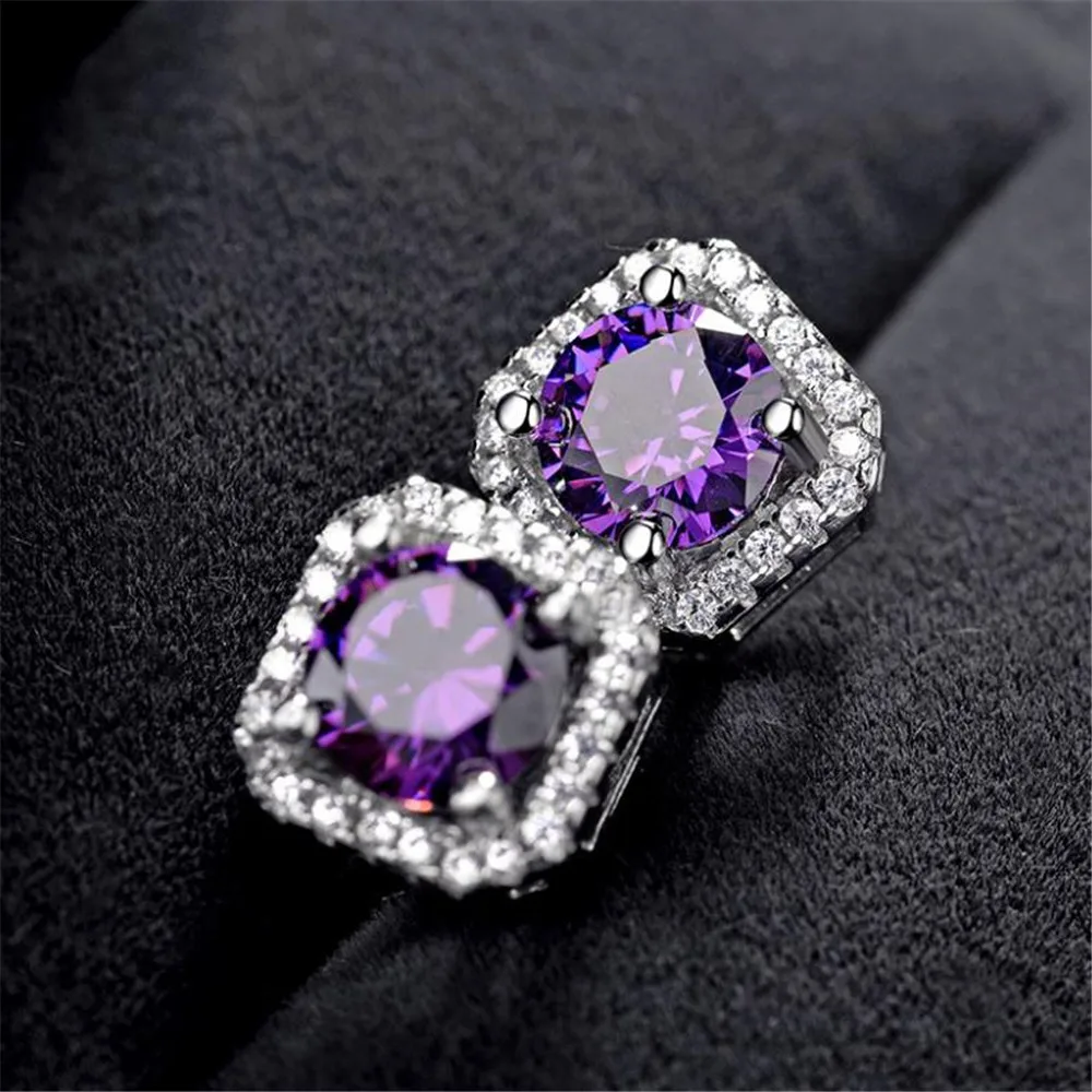 Women's S925 Sterling Silver Inlaid Square AAA Zircon Purple Diamond Stud Earrings Simple Sterling Silver Earrings.