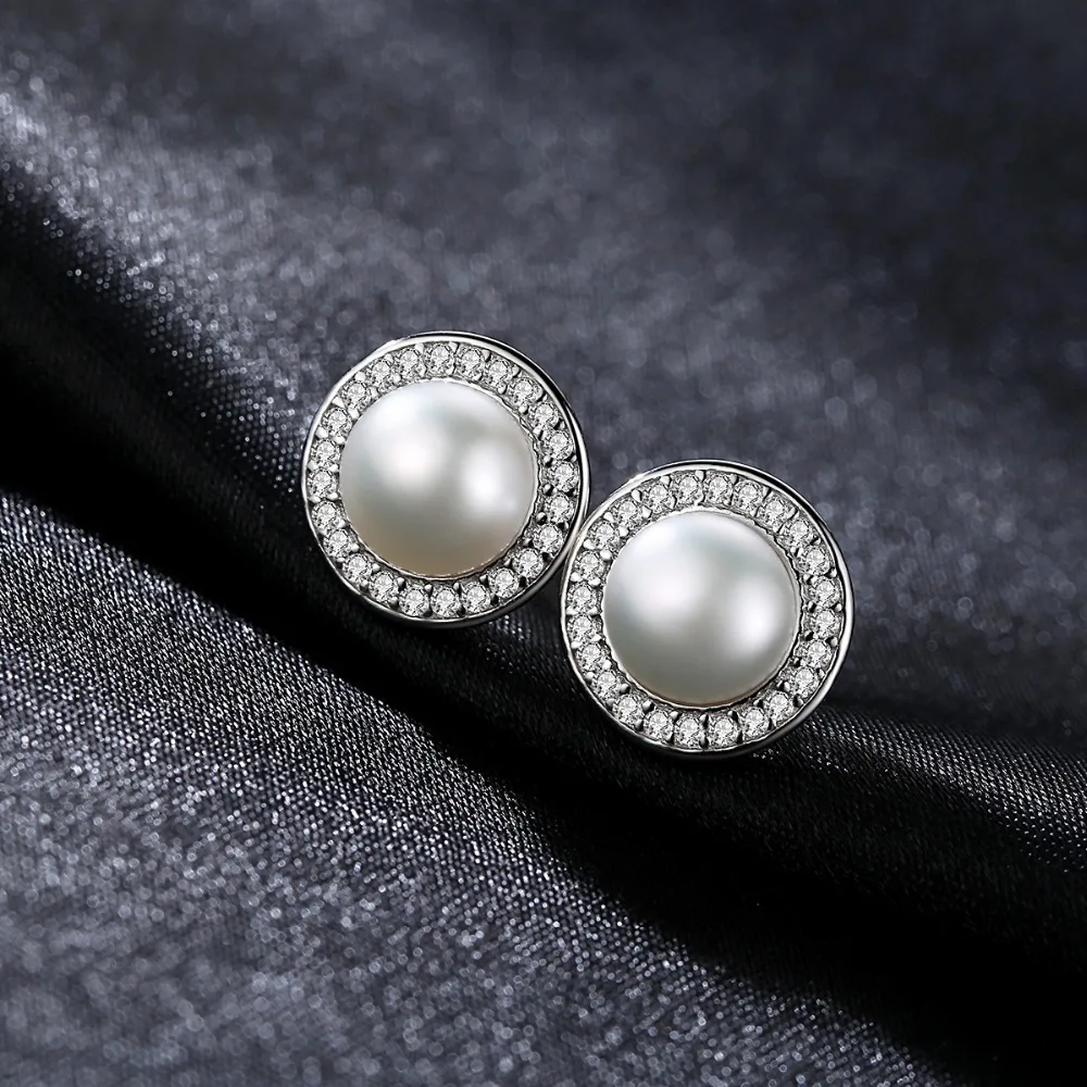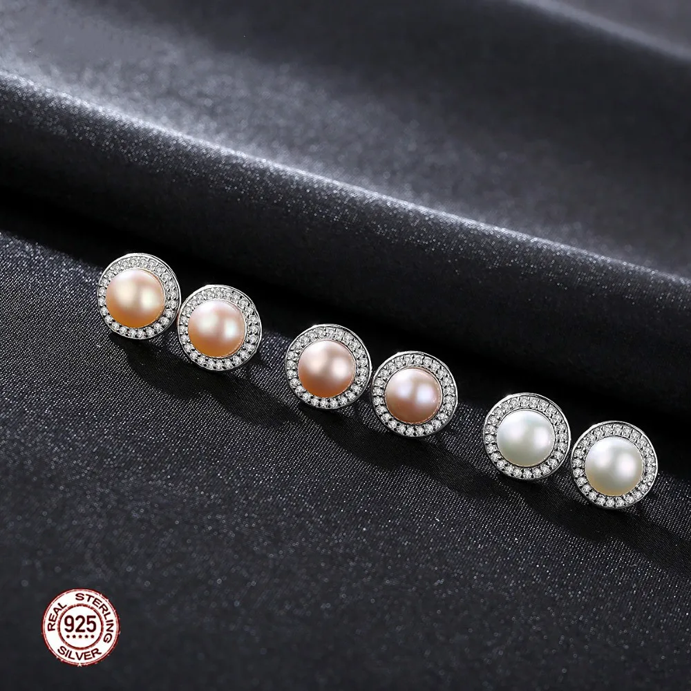 Classic Round High Bright 7-7.5mm Natural Pearl Stud Earrings for Women 925 Sterling Silver Jewelry Hot001