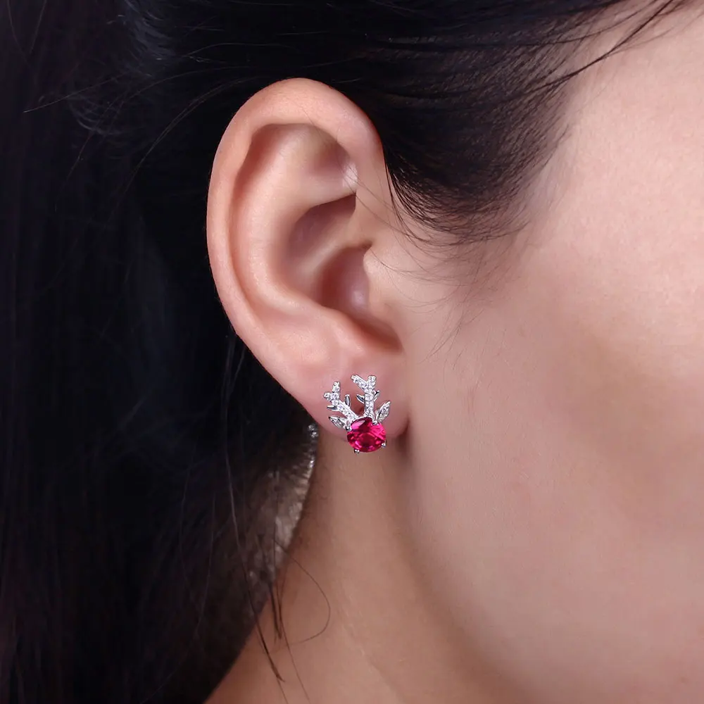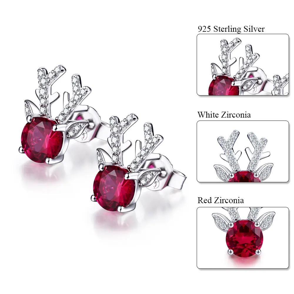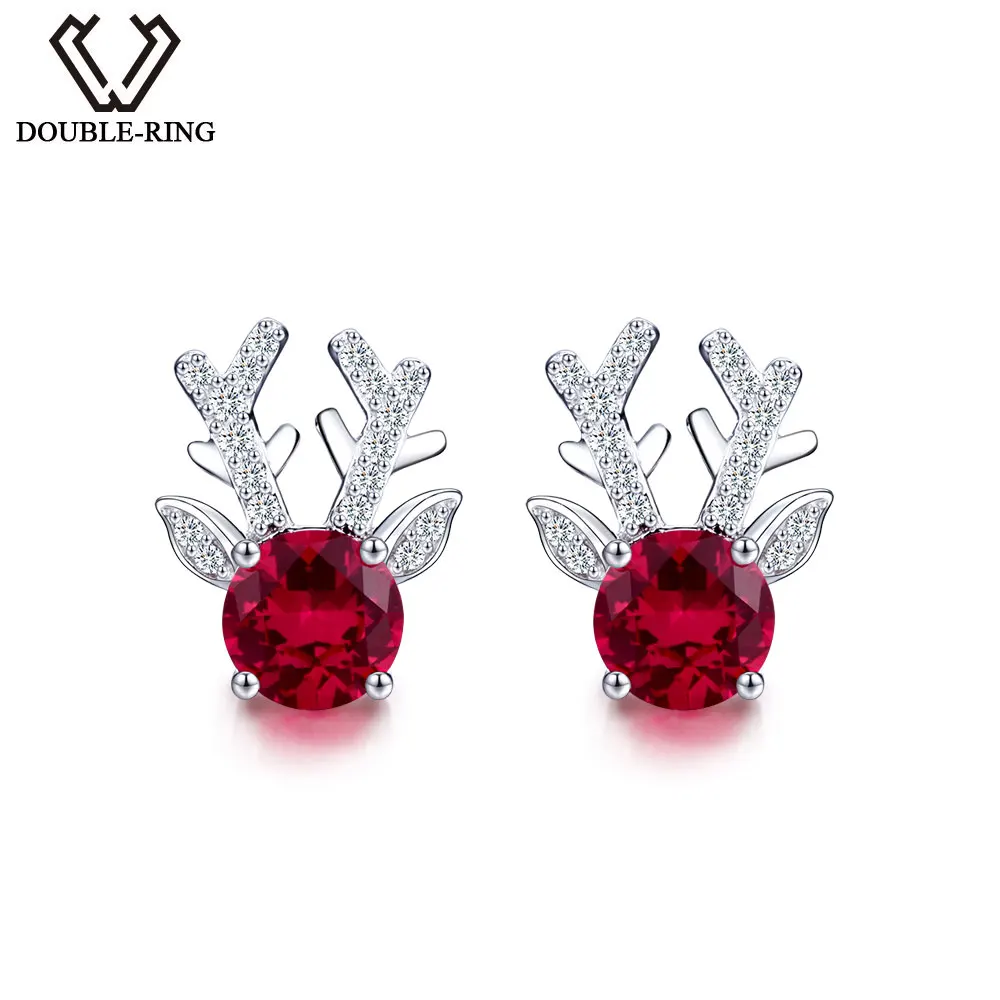 DOUBLE-R Lovely Deer Animal Stud Earrings For Girl 925 Sterling Silver With Created Ruby Rose Gemstone Jewelry