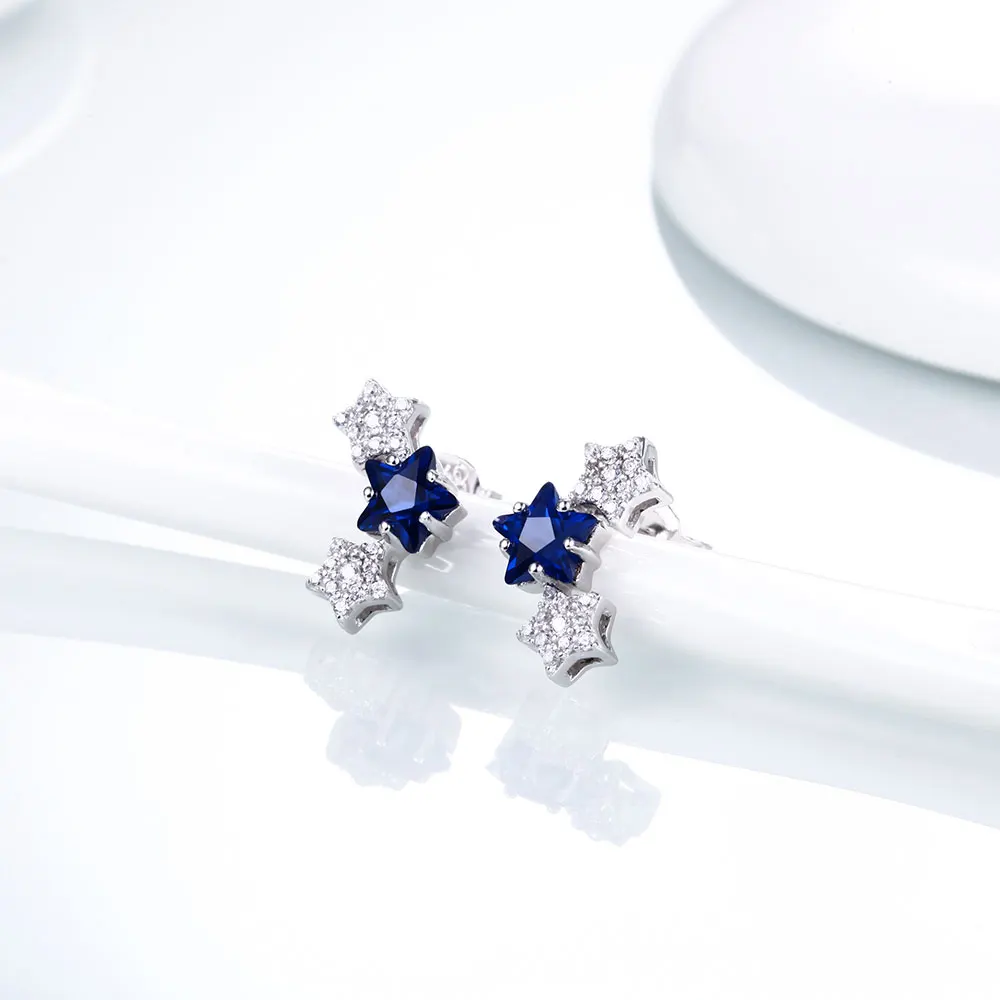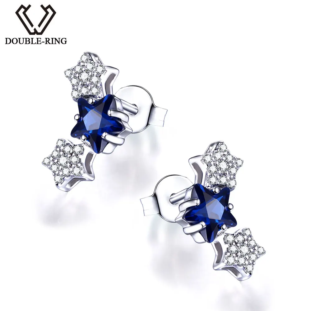 DOUBLE-R Tripe Star Earrings For Girls Real 925 Sterling Silver Stud Earring With Created Sapphire Gemstone Jewelry