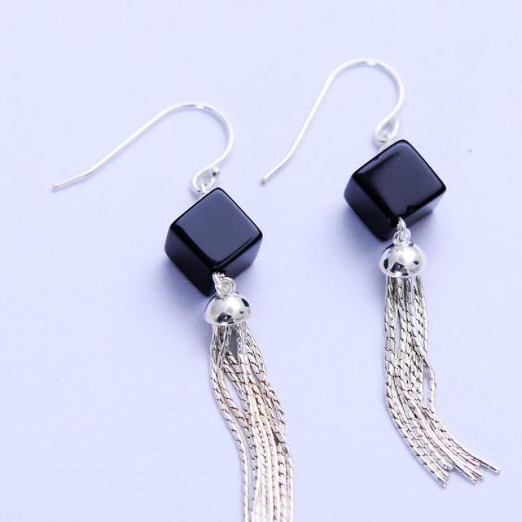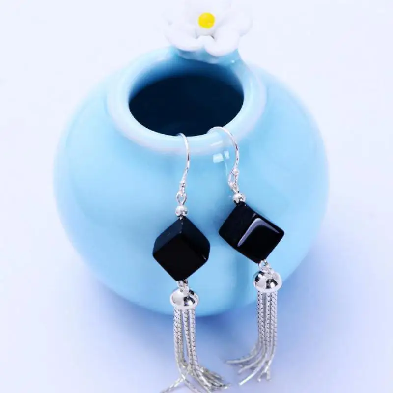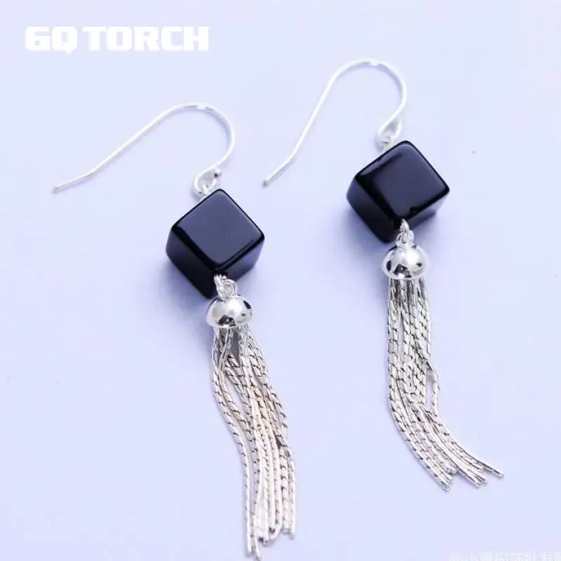 GQTORCH 925 Sterling Silver Tassel Long Earrings Personalized With Square Black Onyx Natural Stone Boucle D'oreille Femme 2020