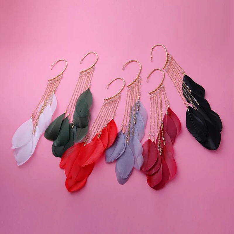 Korean Fashion Earrings Female Long Tassel Feather Earrings Fashion Jewelry Without Ear Hole Ear Women Drop Earrings