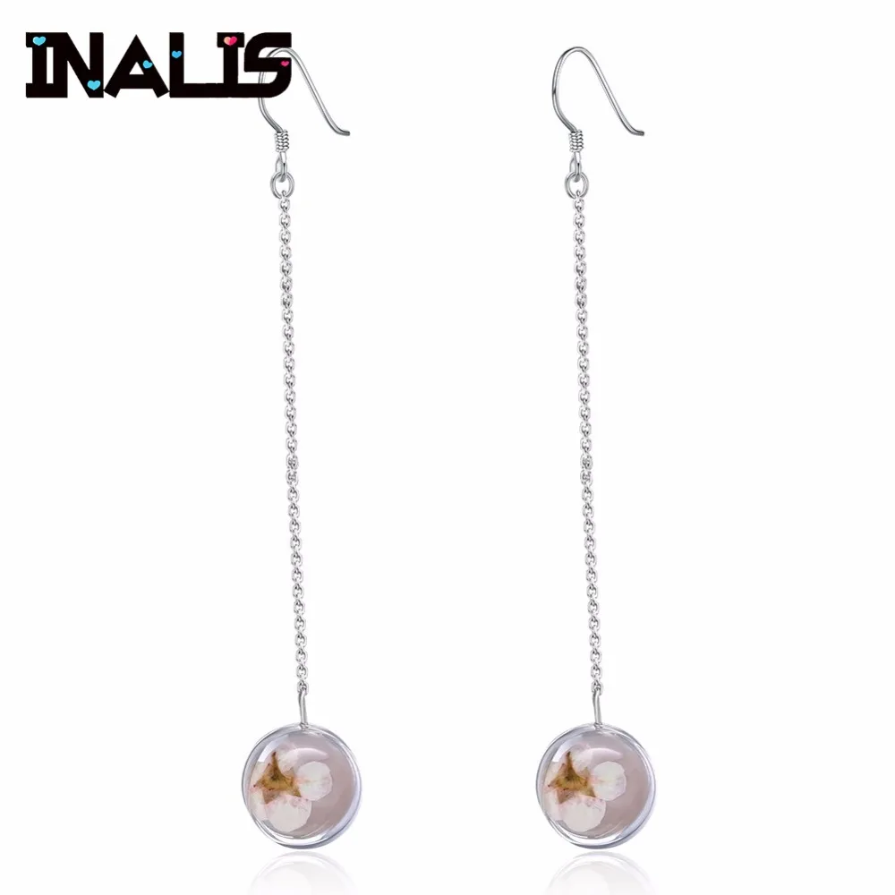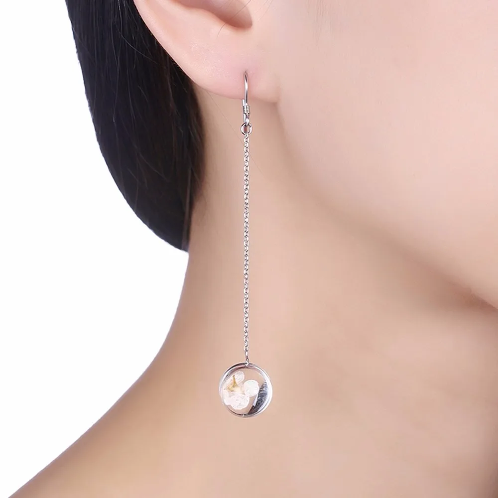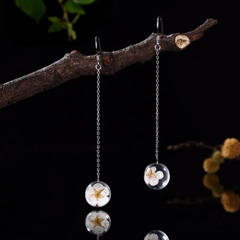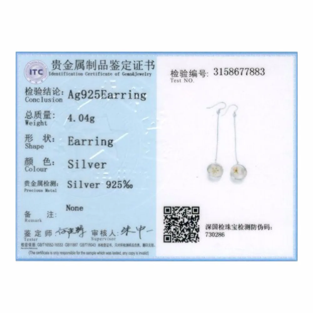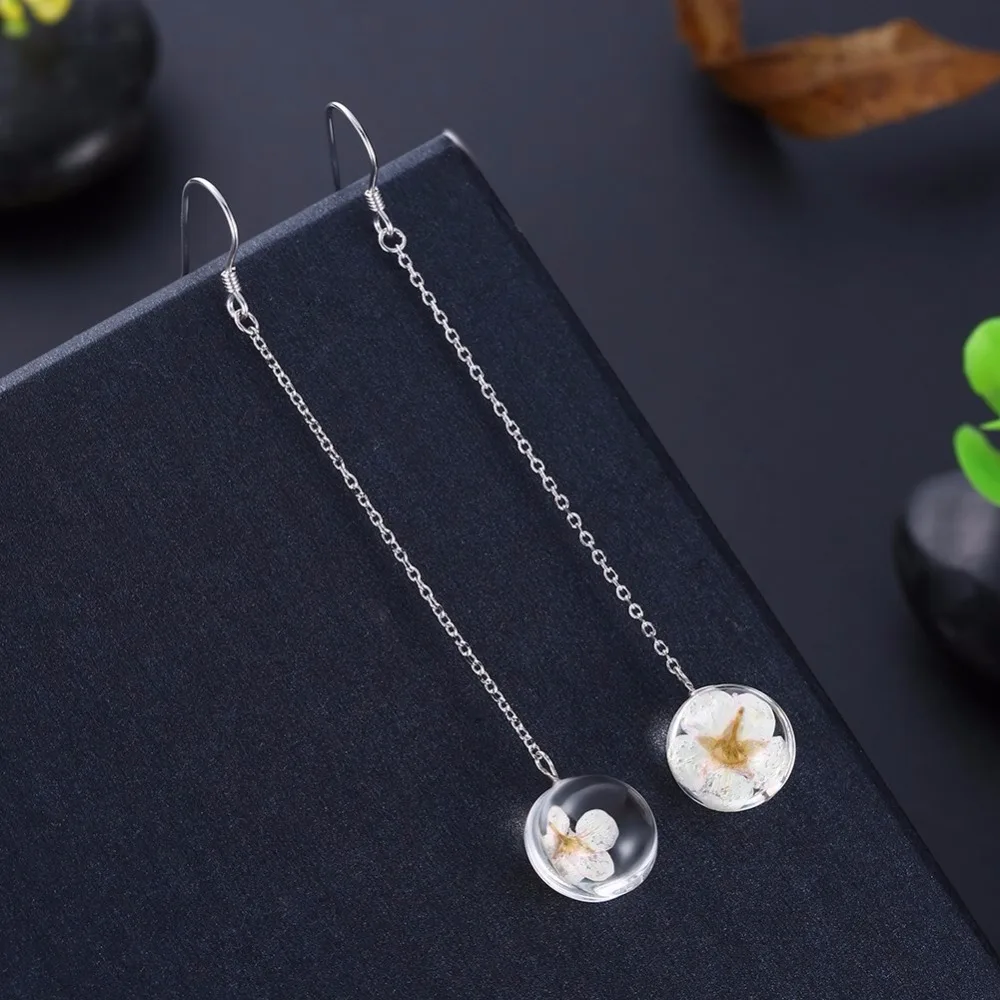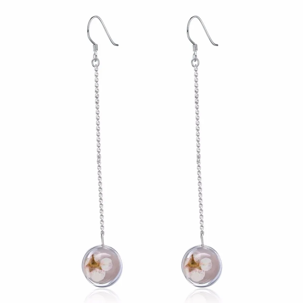 Long Chian S925 Sterling Silver Drop Earrings Flower Inl in Round Clear Resin Delicate Ear Hook for Women Fine Jewelry