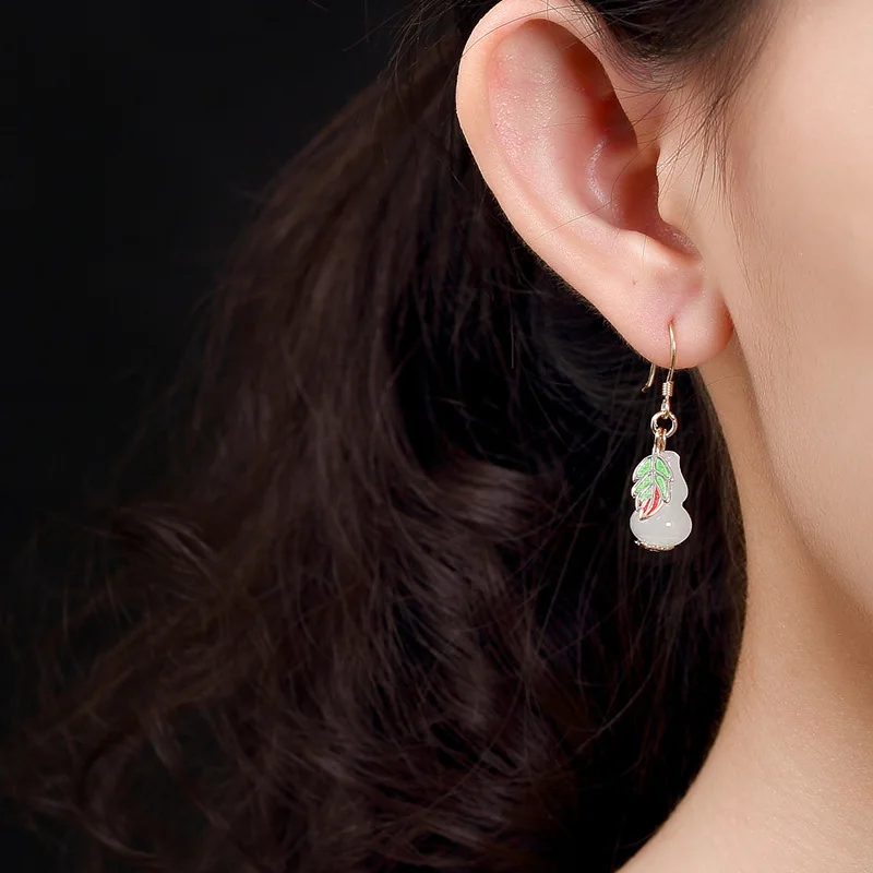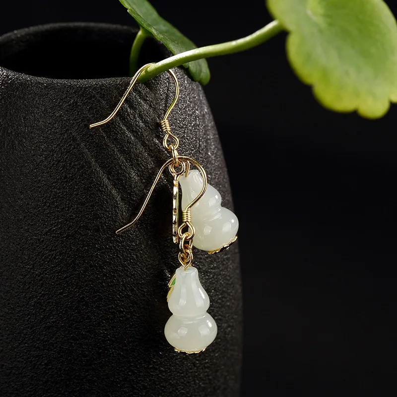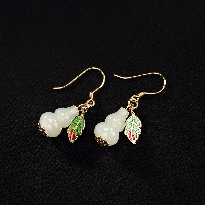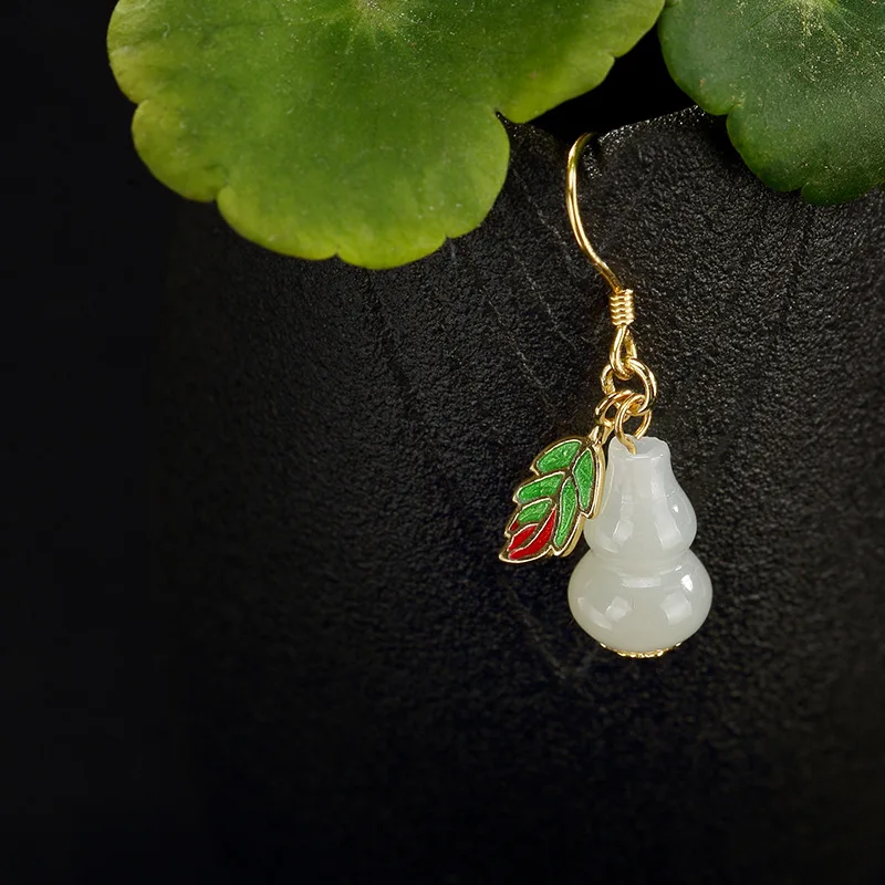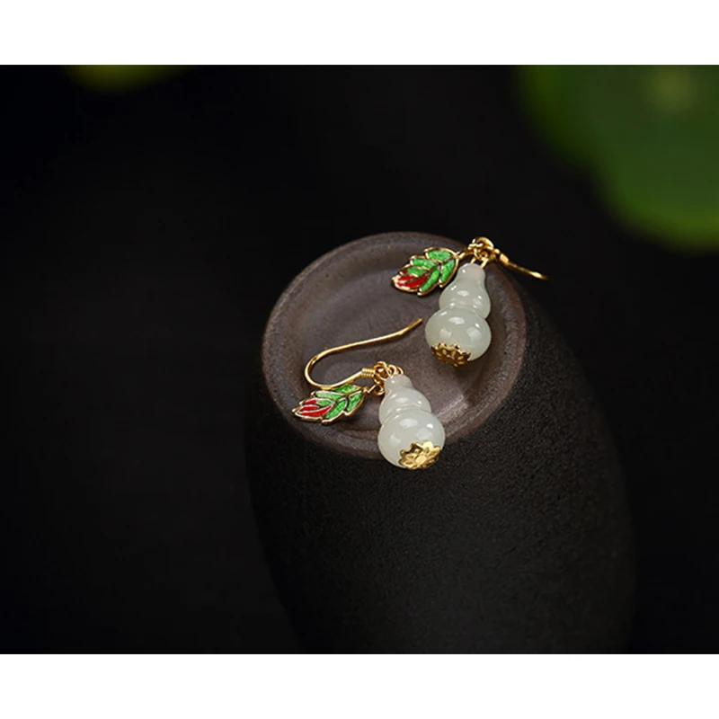 New Elegant Drop Earrings S925 Sterling Silver Gourd Shape Natural Hetian Jade with Multi Leaf Cloisonne Ear Hook Jewelry