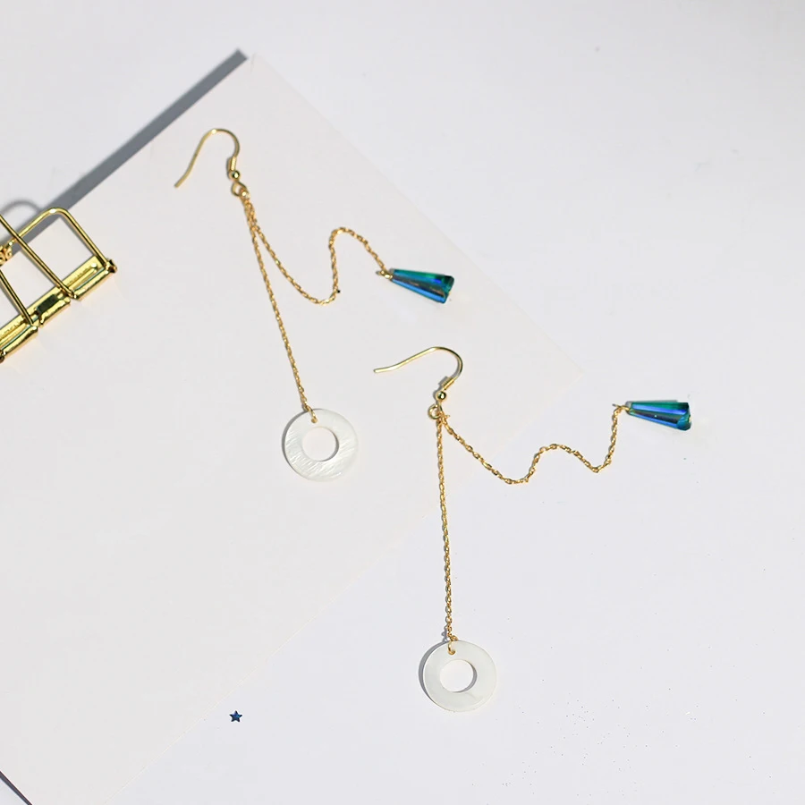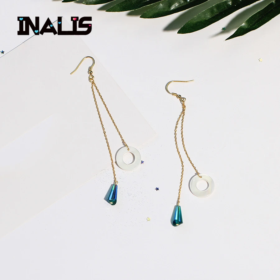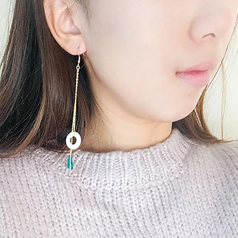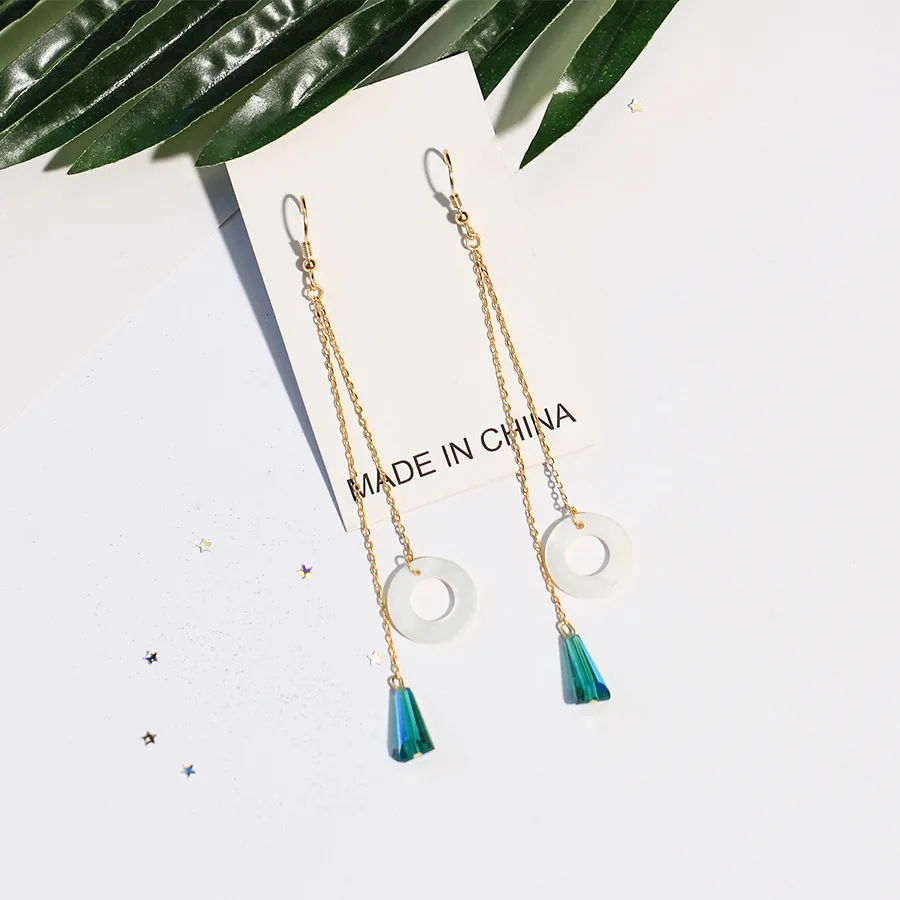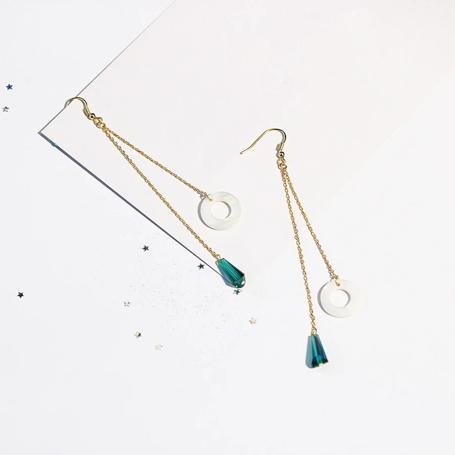 New Long Double Chain Ear Line Hook S925 Sterling Silver Green Crystal Round Sea Shell Dangle Drop Earrings for Women