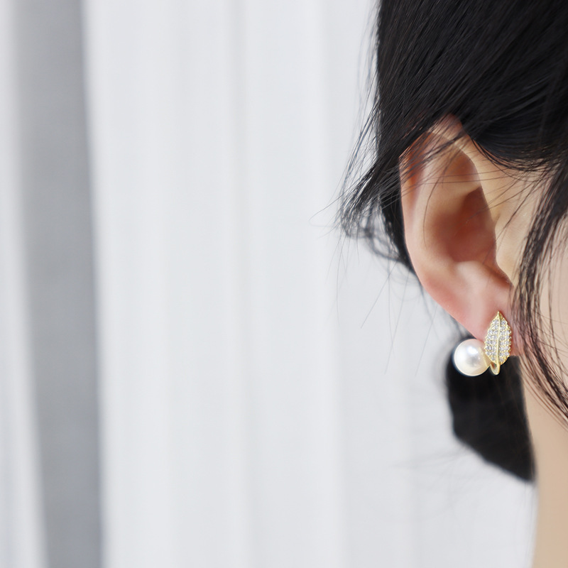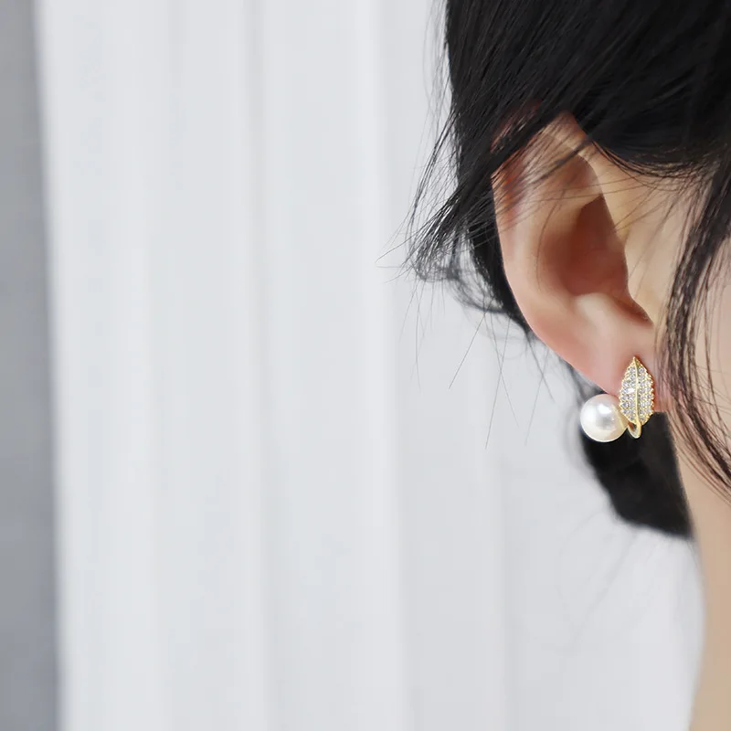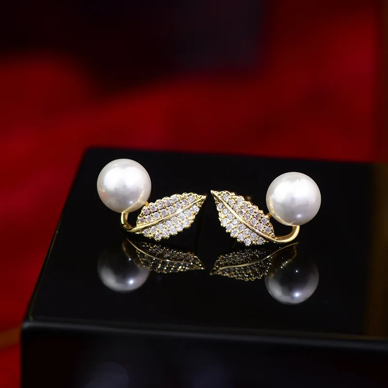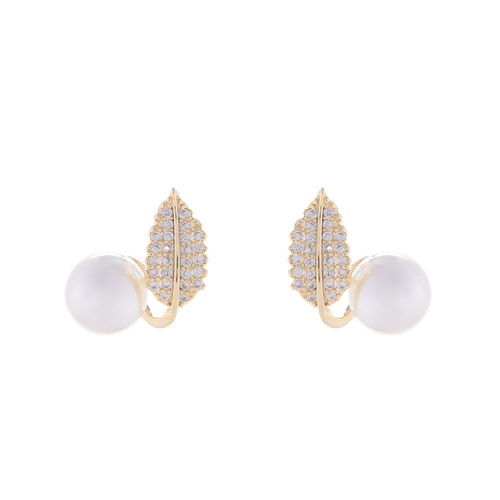 Korea Design Jewelry Exquisite Copper Set Zircon Leaf Pearl Earrings Elegant Women's Daily Work Accessories