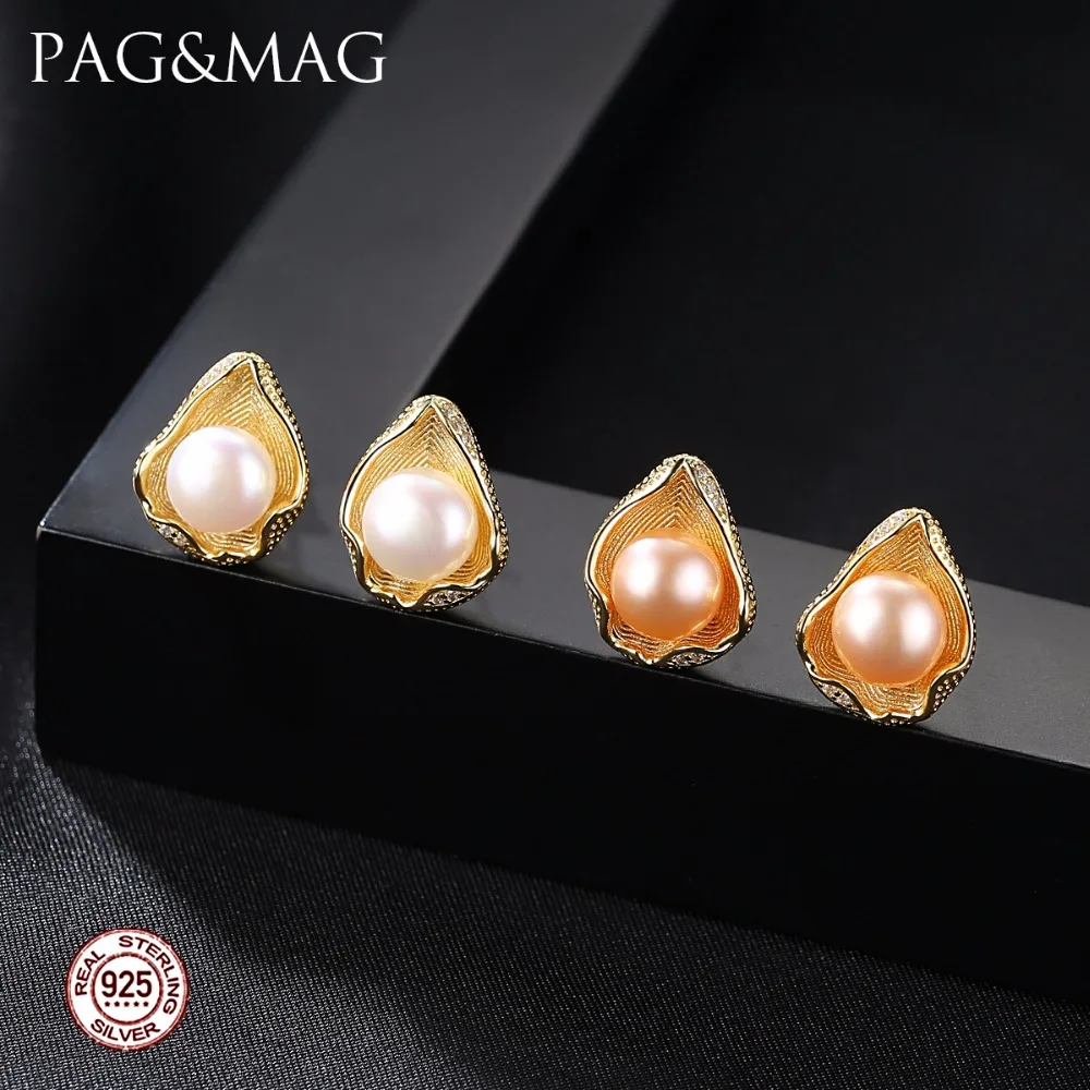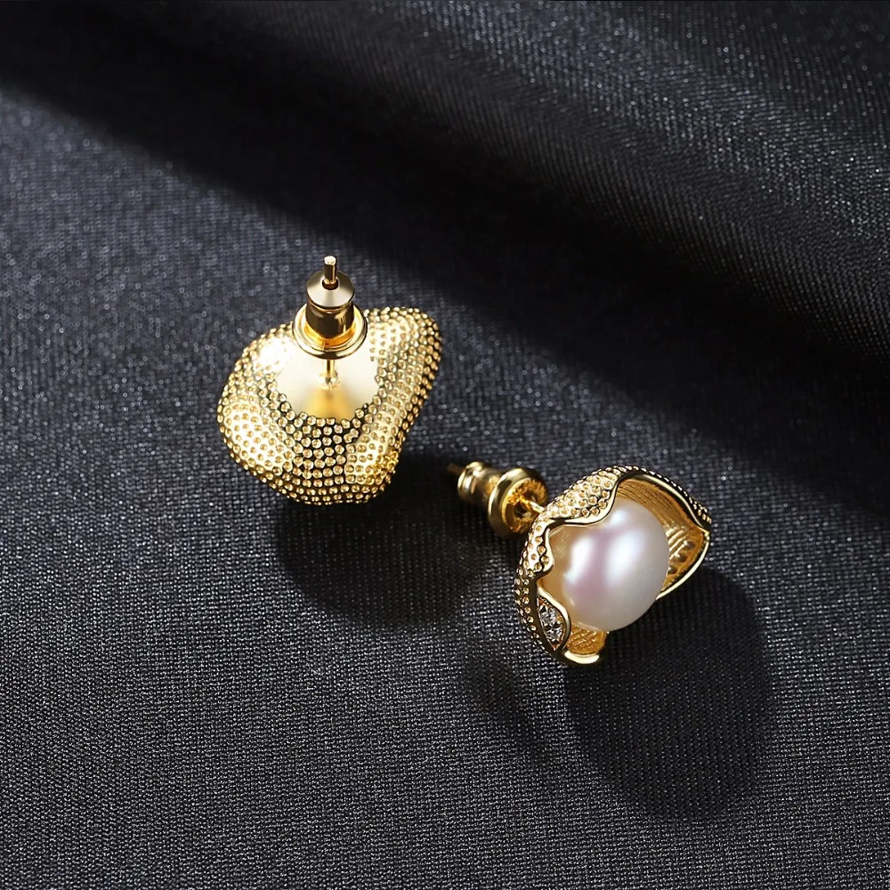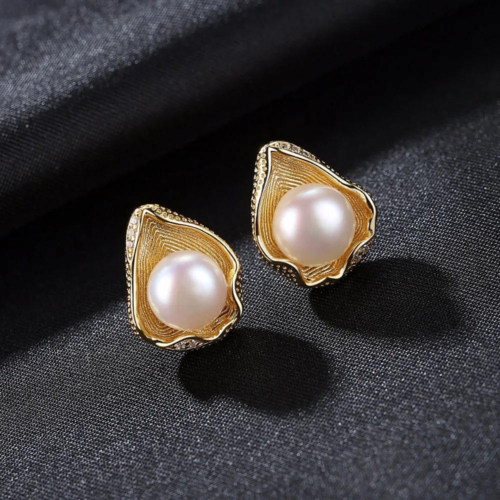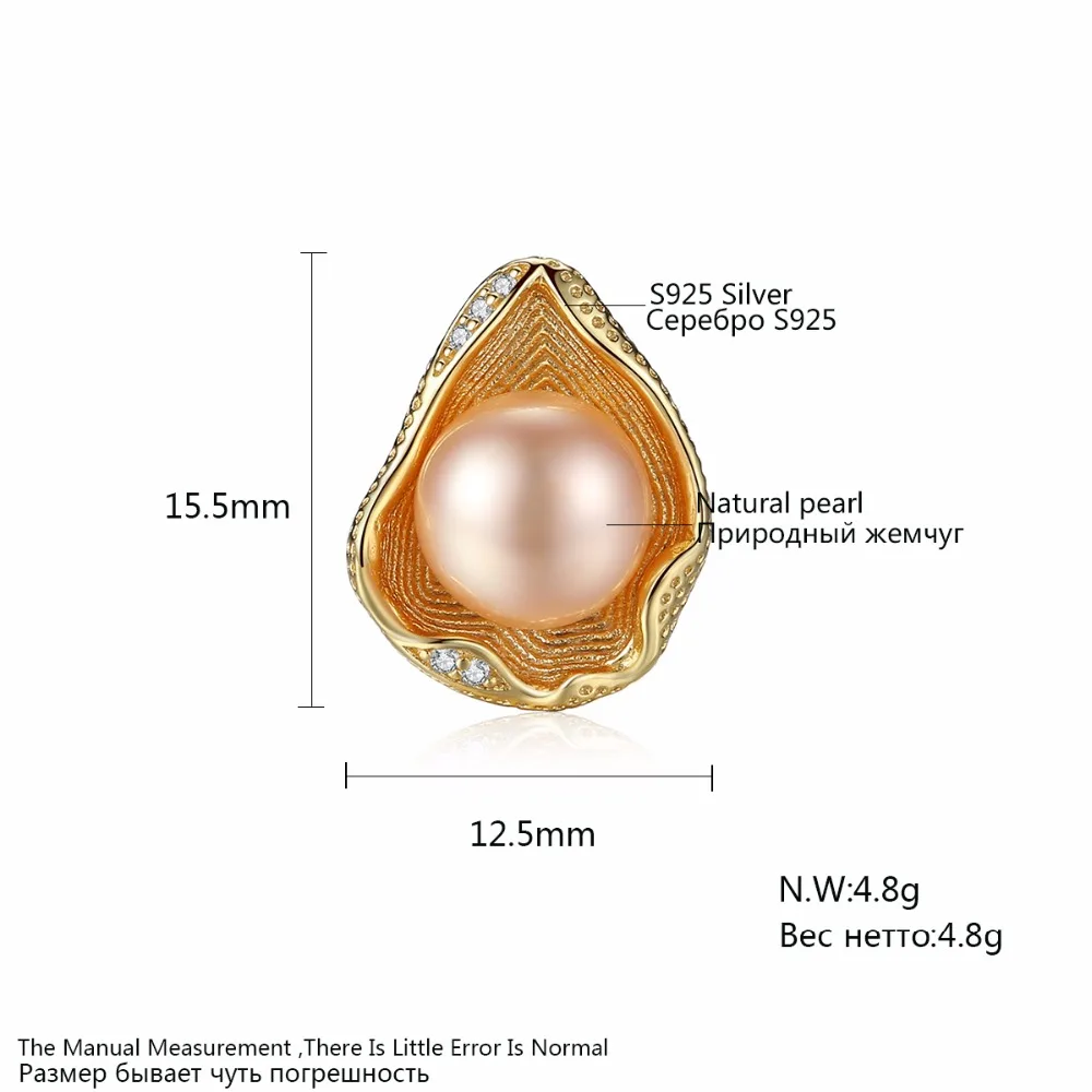Charm 18k Gold Color Shell Design Real Sterling Silver 925 Pearl Fashion Stud Earrings for Women