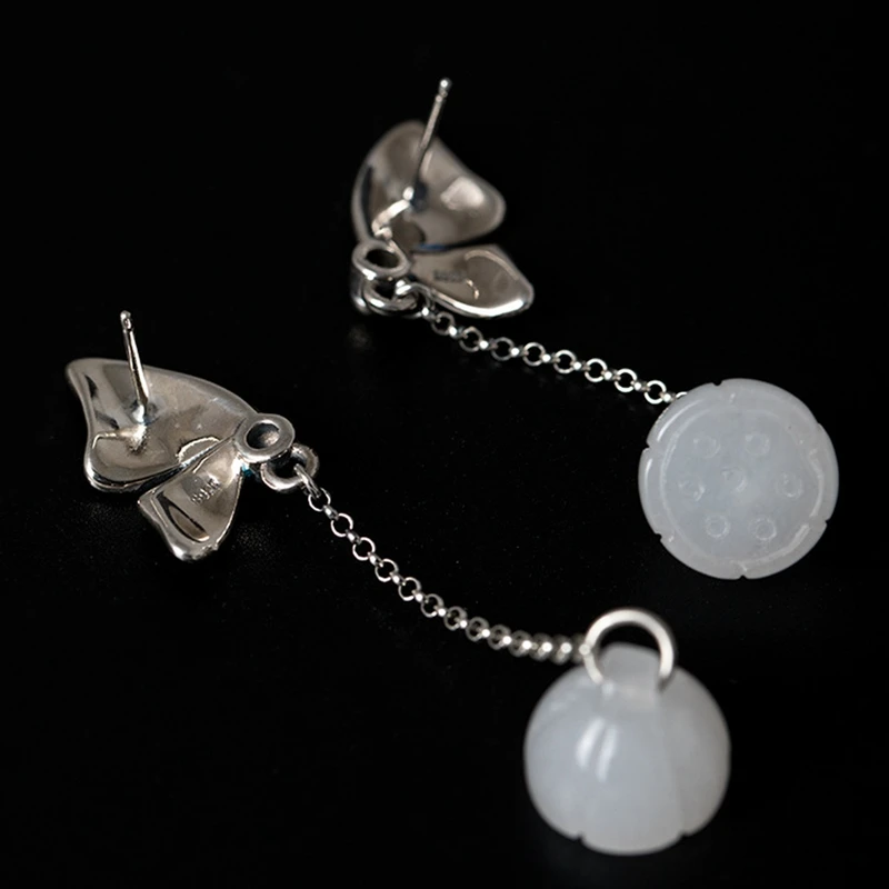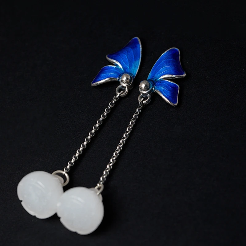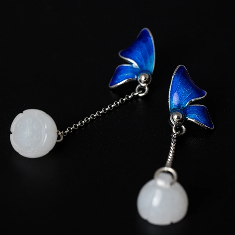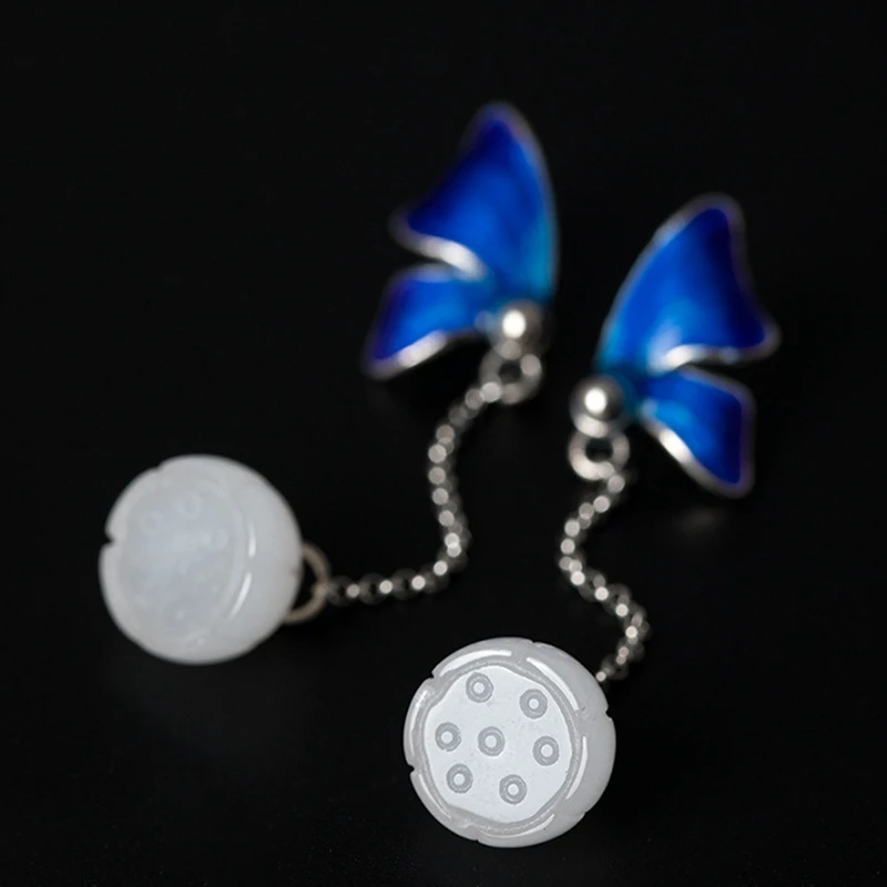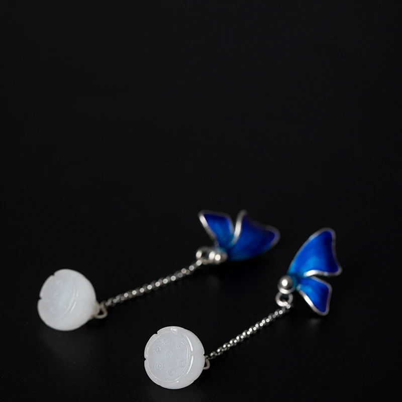 Pure handmade 12mm white jade sterling 925 silver enamel butterfly earrings elegant ethnic design drop earrings women jewelry