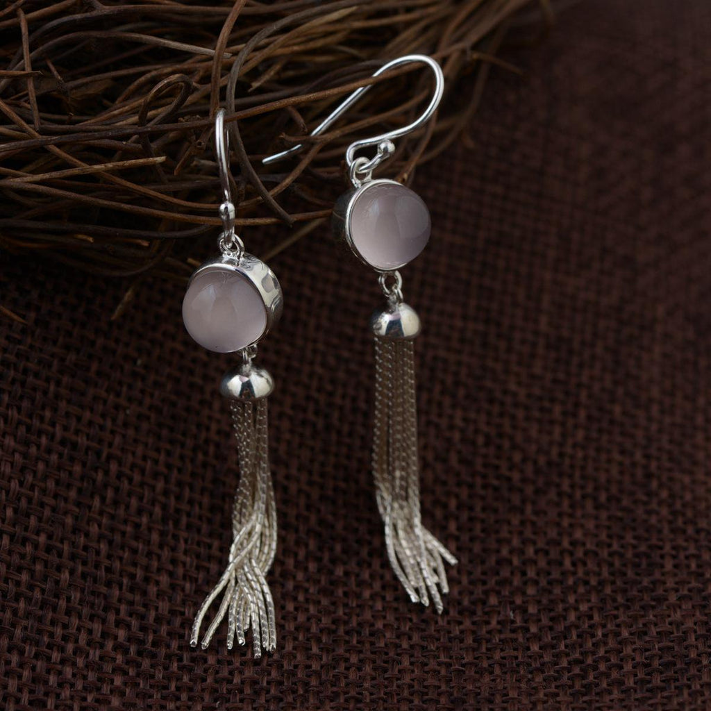 Real 925 Sterling Silver Long Tassels Earrings For Women Inlaid Rose Quartz Natural Stone Drop Earrings Fine Jewelry