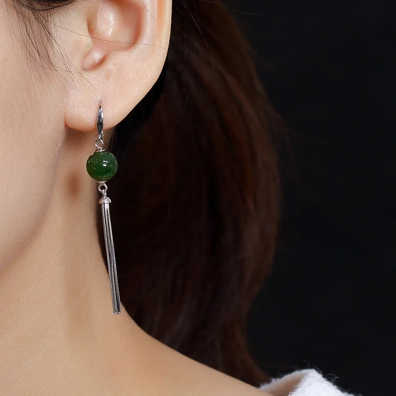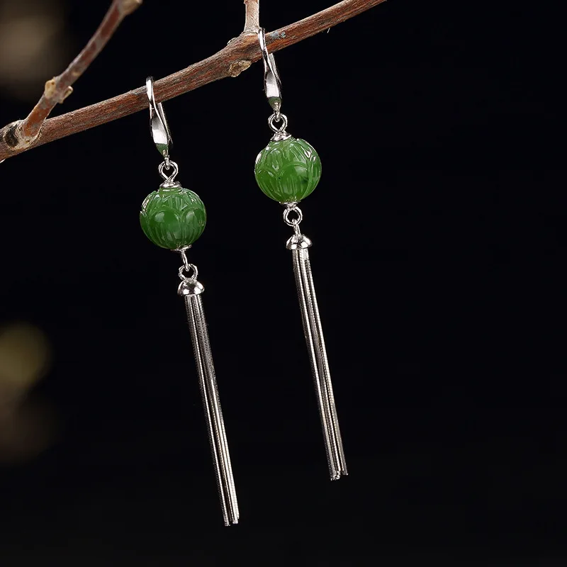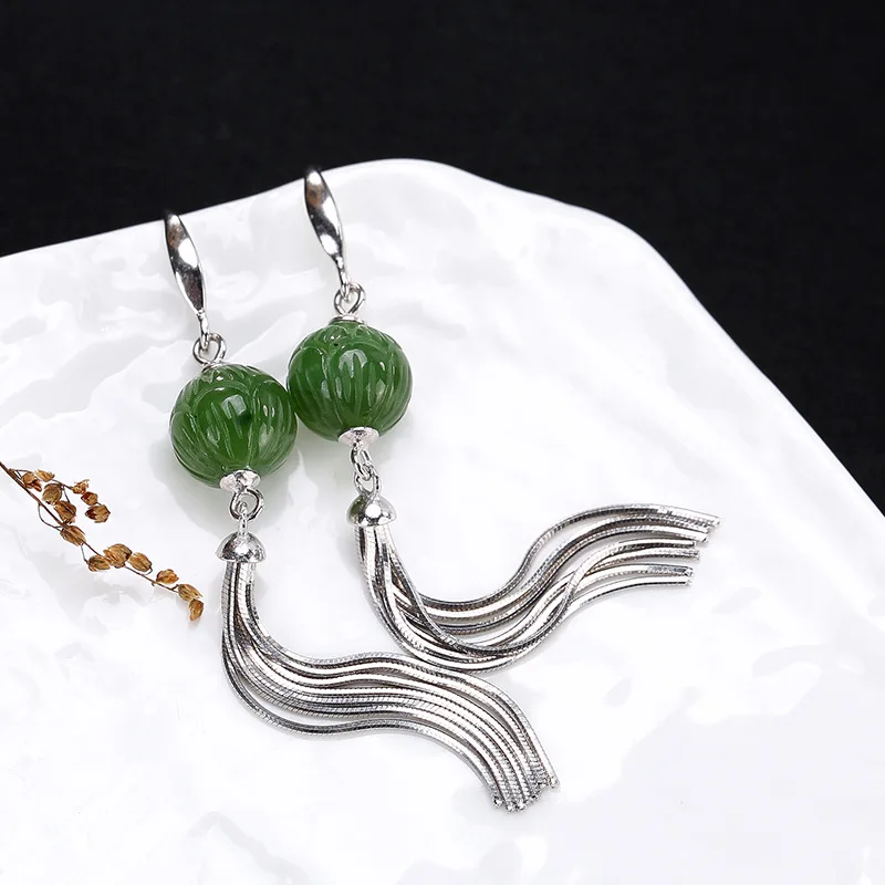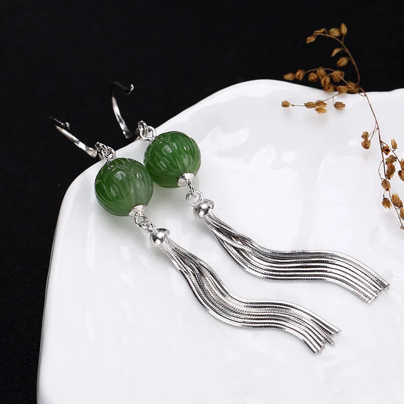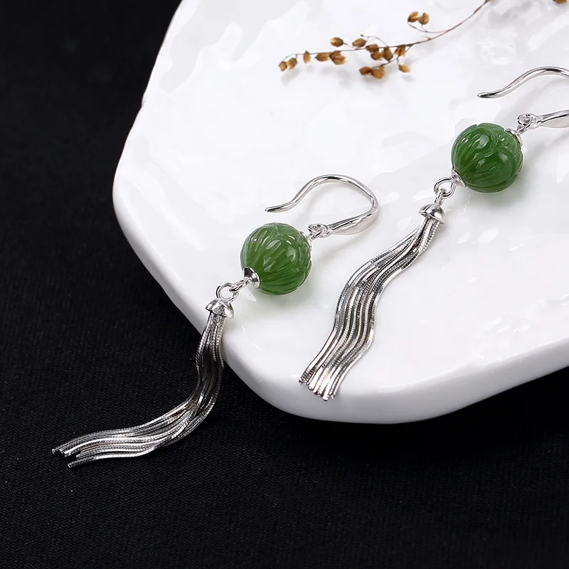 Real Silver 925 Long Tassel Earrings Hook Inlaid Natural Gemstone Hetian Jade Jasper Lotus Engraved Women Fine Jewelry
