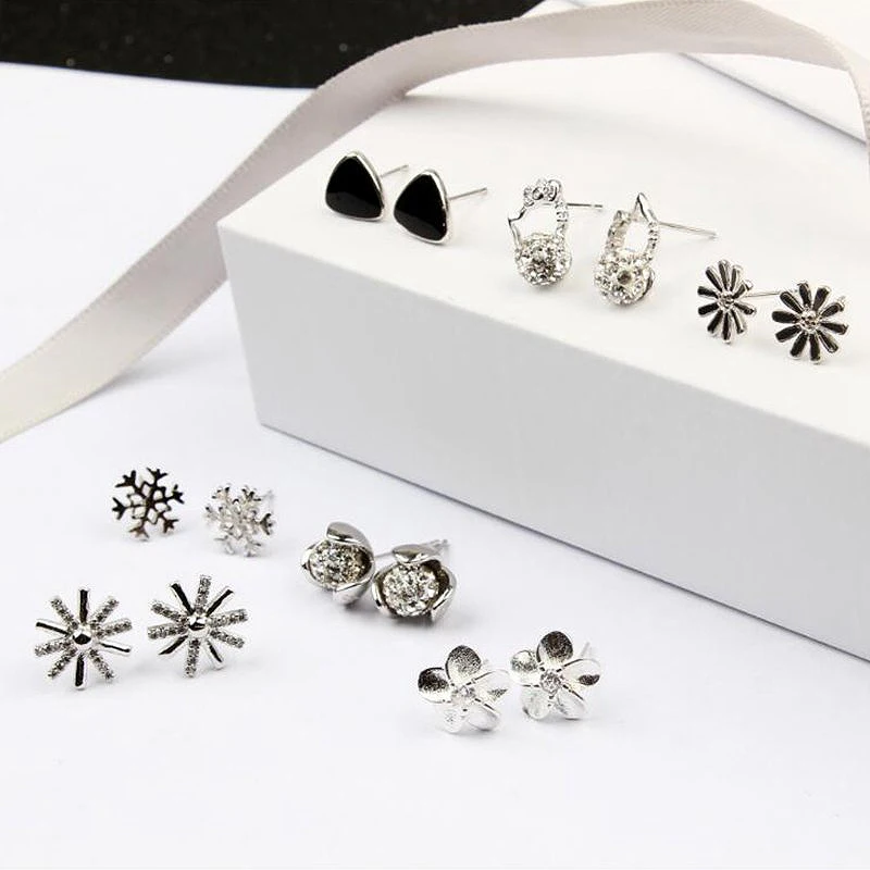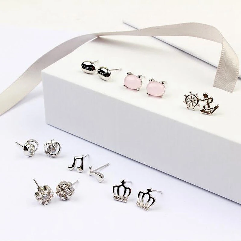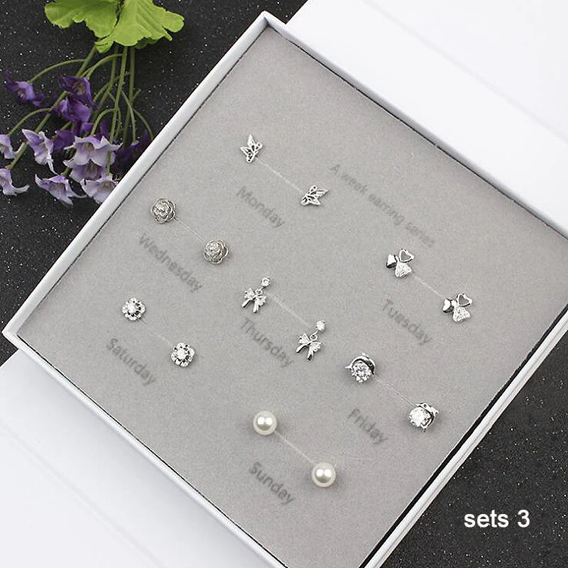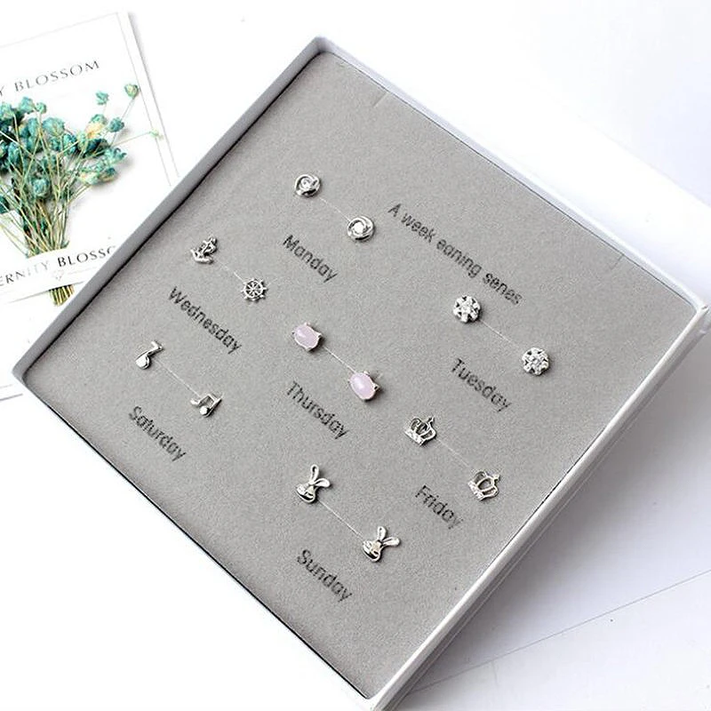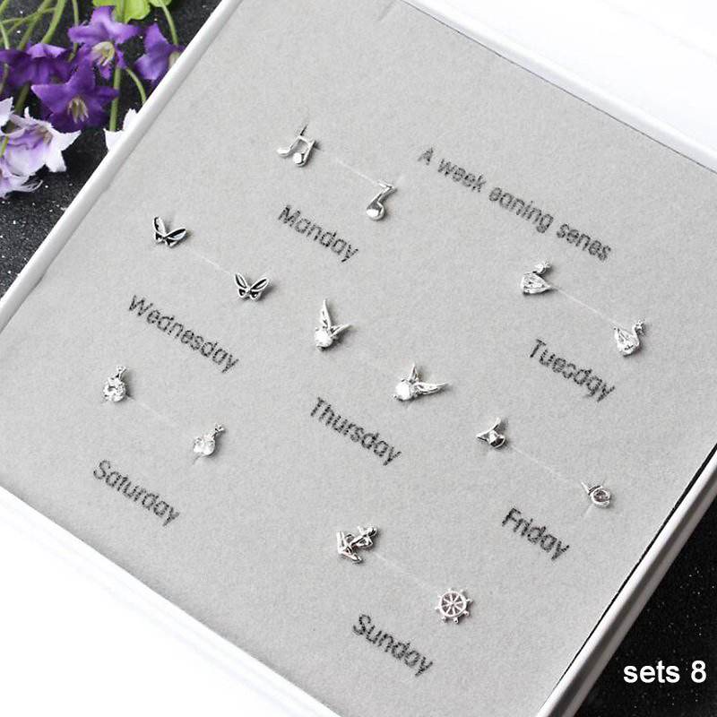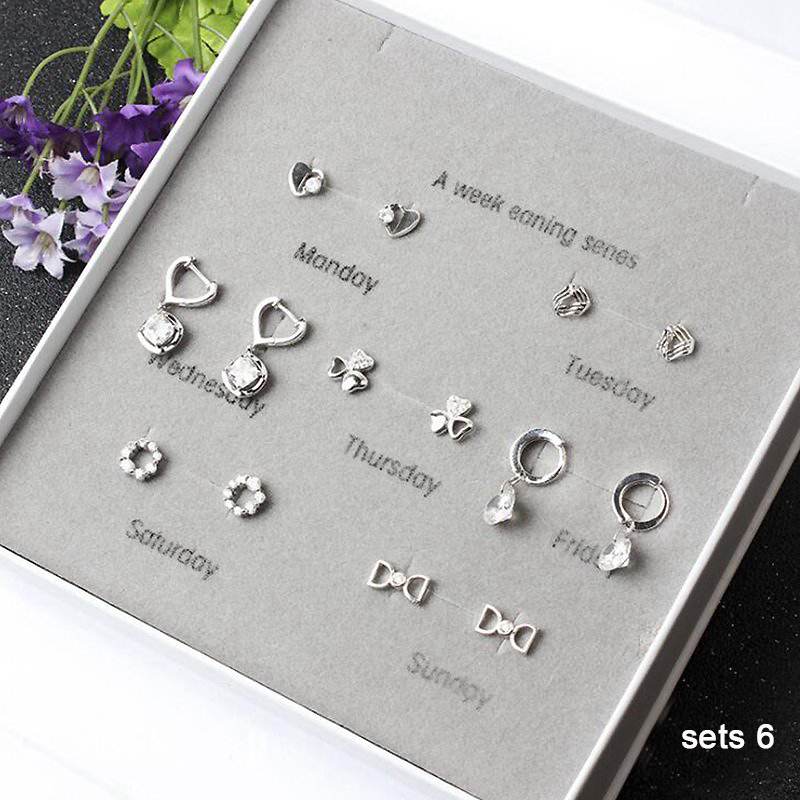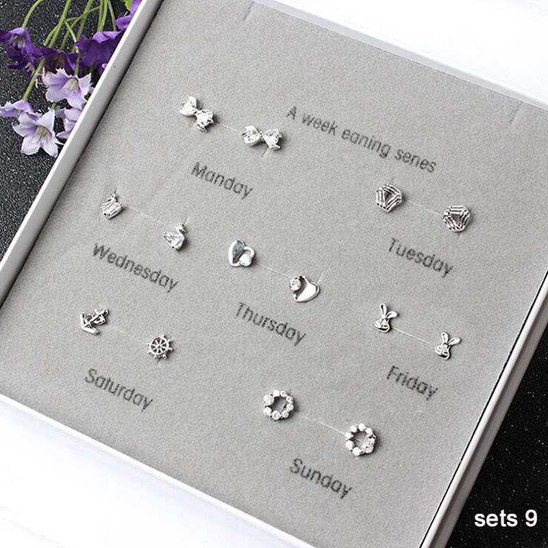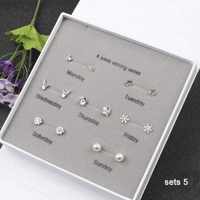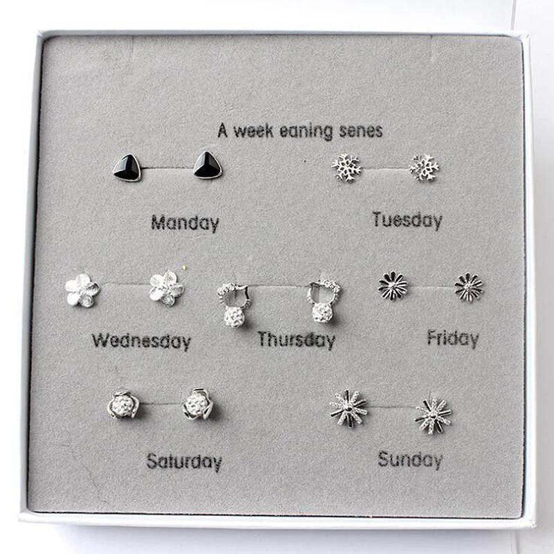 One Week 7 pairs/set Small Stud Earrings Set with Box 2020 Women's Earring 925 Sterling Silver Earrings with Stone YJS005