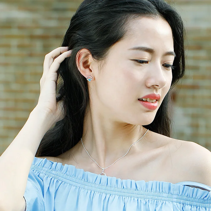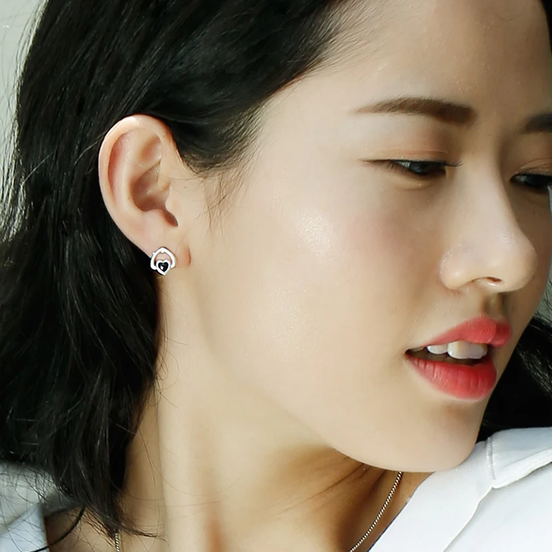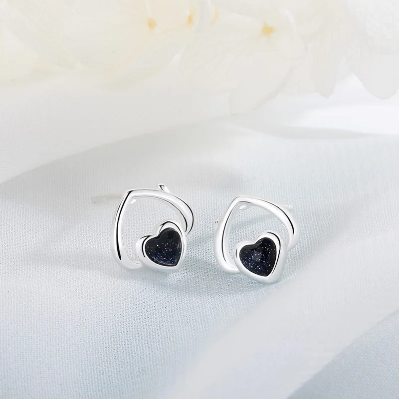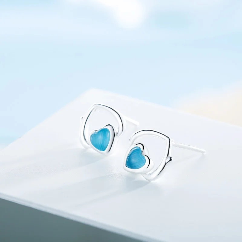 Real 925 Sterling Silver Love Heart Shape Stud Earrings for Women Crystal Sand Cat's Eye Fine Anniversary Jewelry