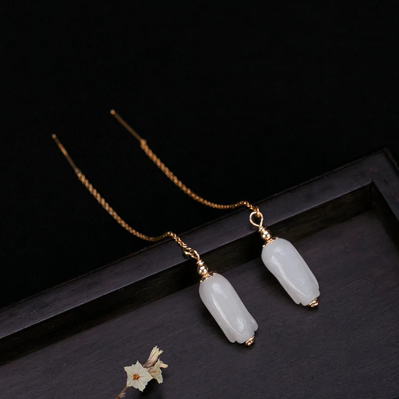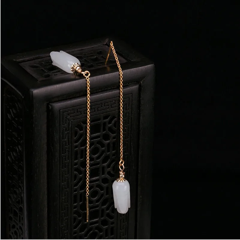 Real S 925 Sterling Silver Ear Lines Elegant Women Magnolia Floral Dangle Earrings Natural Gemstone White Jade Earrings