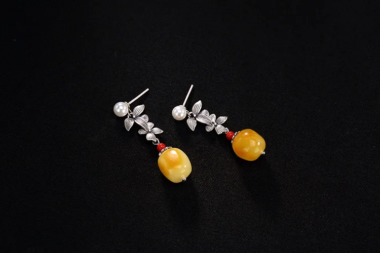 Real S 925 Sterling Silver Natural Amber Earrings for Women Beeswax Brincos Handmade Flowers Fine Jewelry Pearl Bijoux