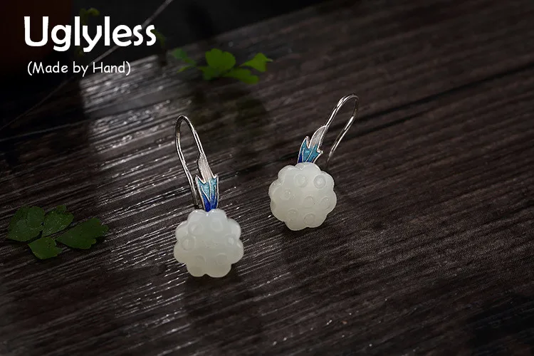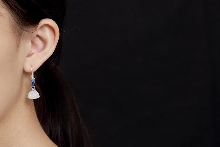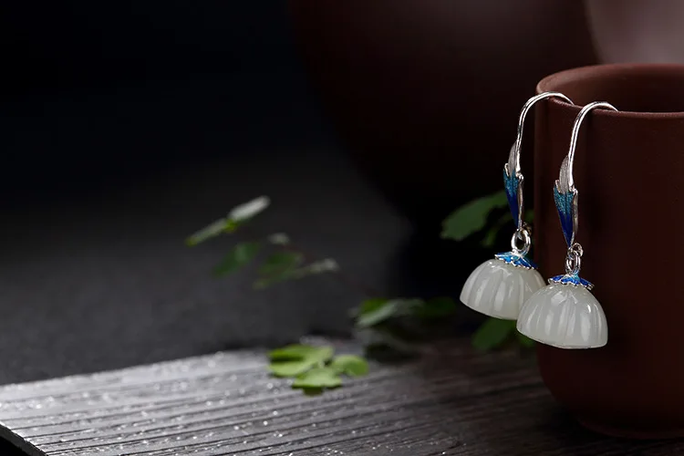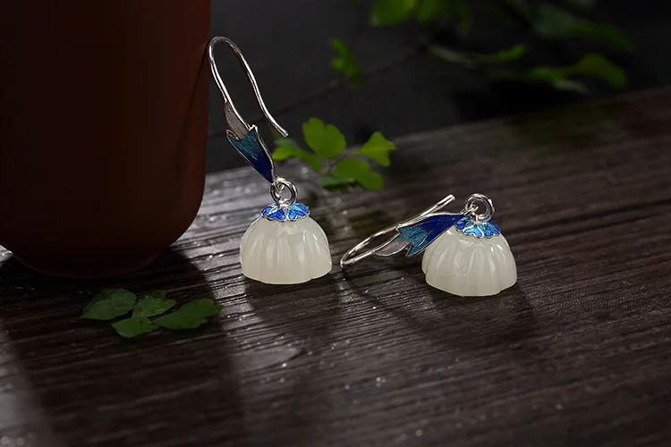 Real S 925 Sterling Silver Natural Lotus Jade Earrings Women Enamel Floral Brincos Ethnic Fine Jewelry Handmade Bijoux