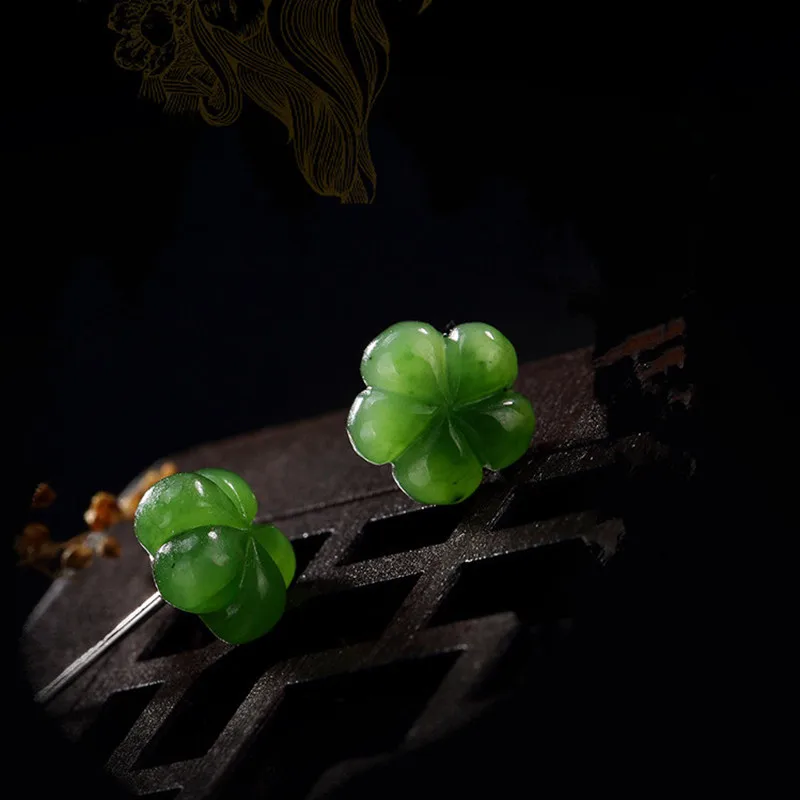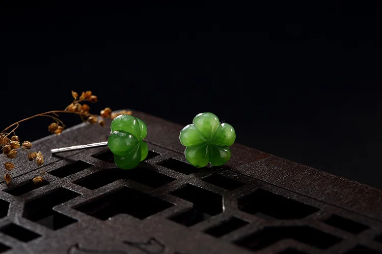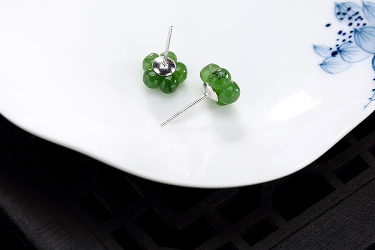 Real S 925 Sterling Silver Nature Green Jade Plum Flower Stud Earrings Women Fine Jasper Jewelry Handmade Ethnic Bijoux