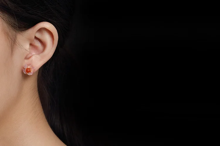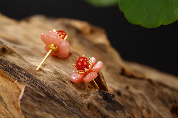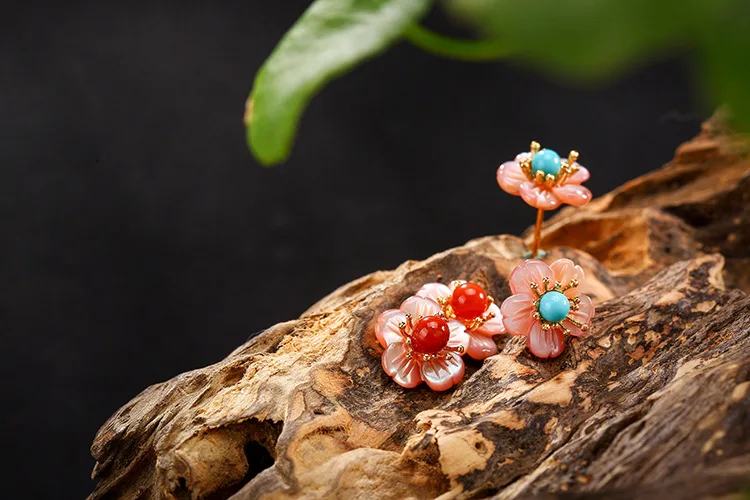 Real S925 Sterling Silver Natural Pink Shell Flower Stud Earrings Turquoise Beads Brincos Bijoux for Women Fine Jewelry