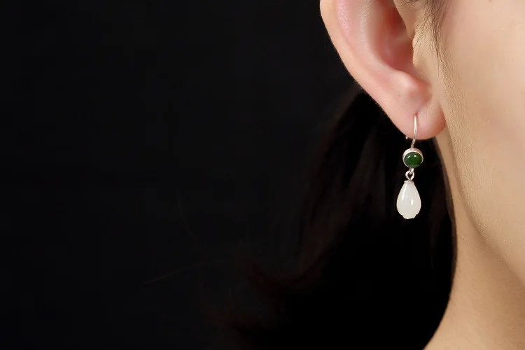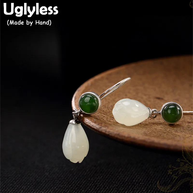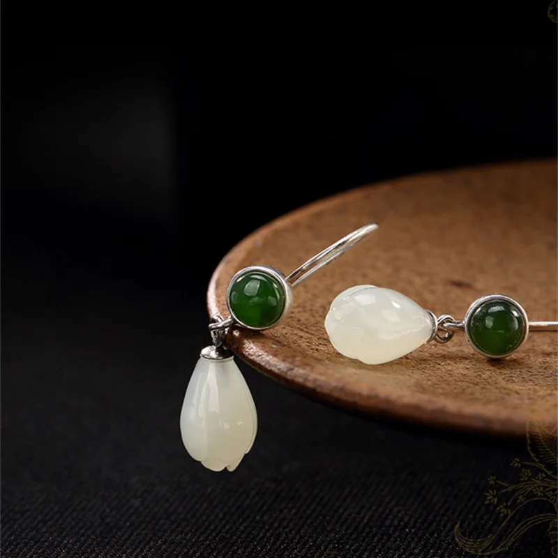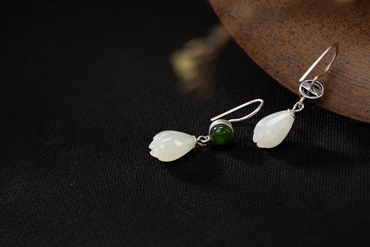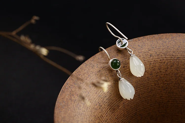 S 925 Sterling Silver Natural White Jade Orchid Dangle Earrings Women Elegant Jasper Beads Brincos Floral Fine Jewelry