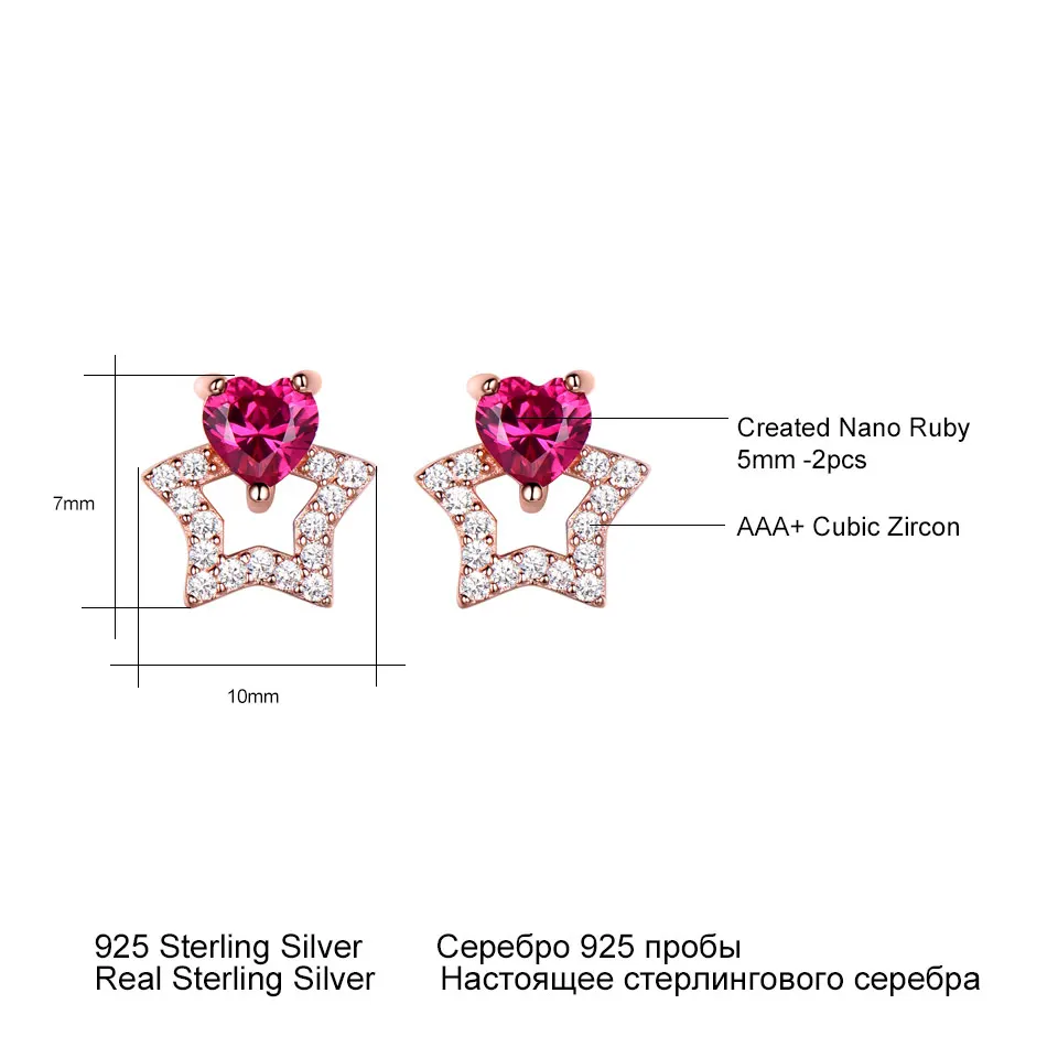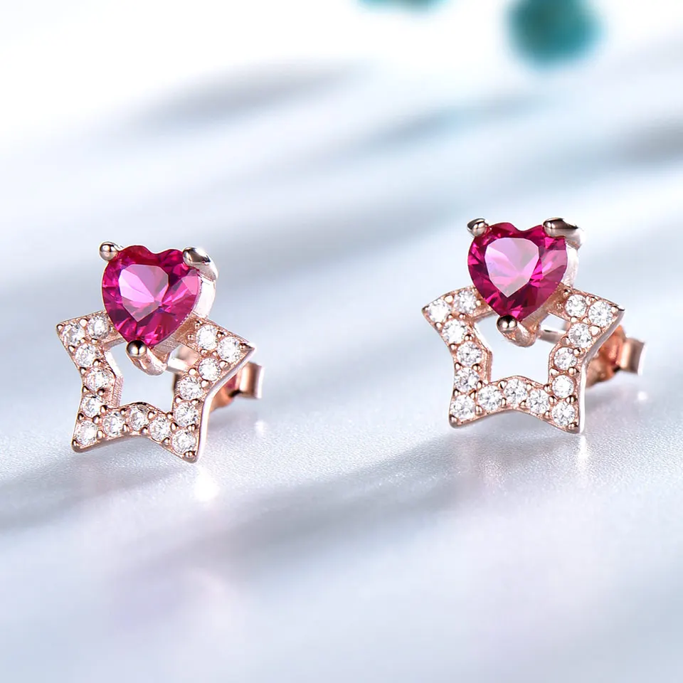 925 Sterling Silver Jewelry Created Red Ruby Heart Start Stud Earrings For Lover Anniversary Romantic Gifts Fine Jewelry