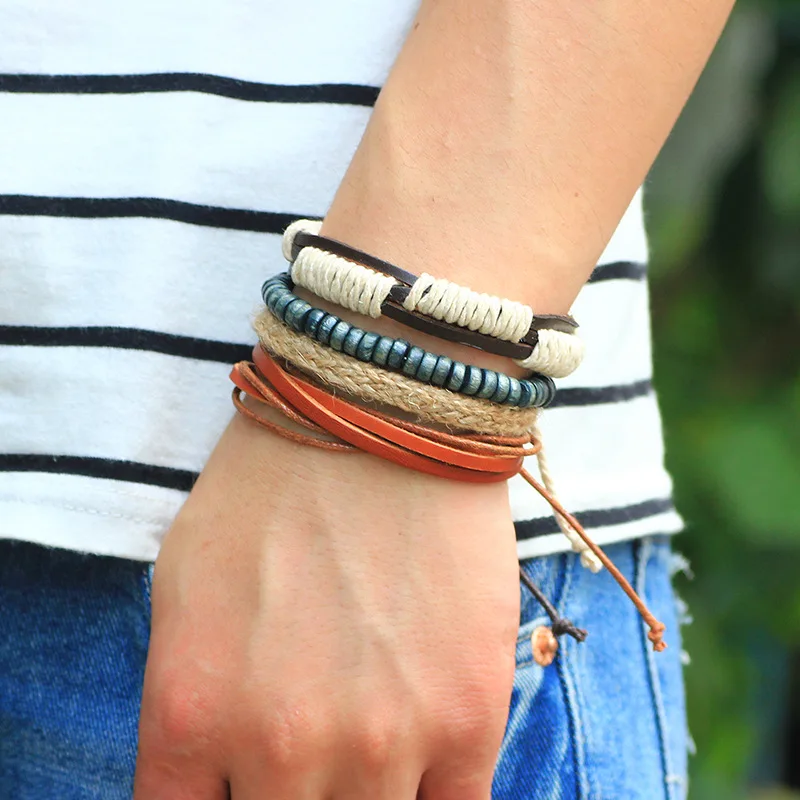 Homme 1 Set 4 pcs Wrap Around Bracelet Pull-Closure Leather Braclet Masculino Pulseira Bilezik Erkek Brazalete Bracciales
